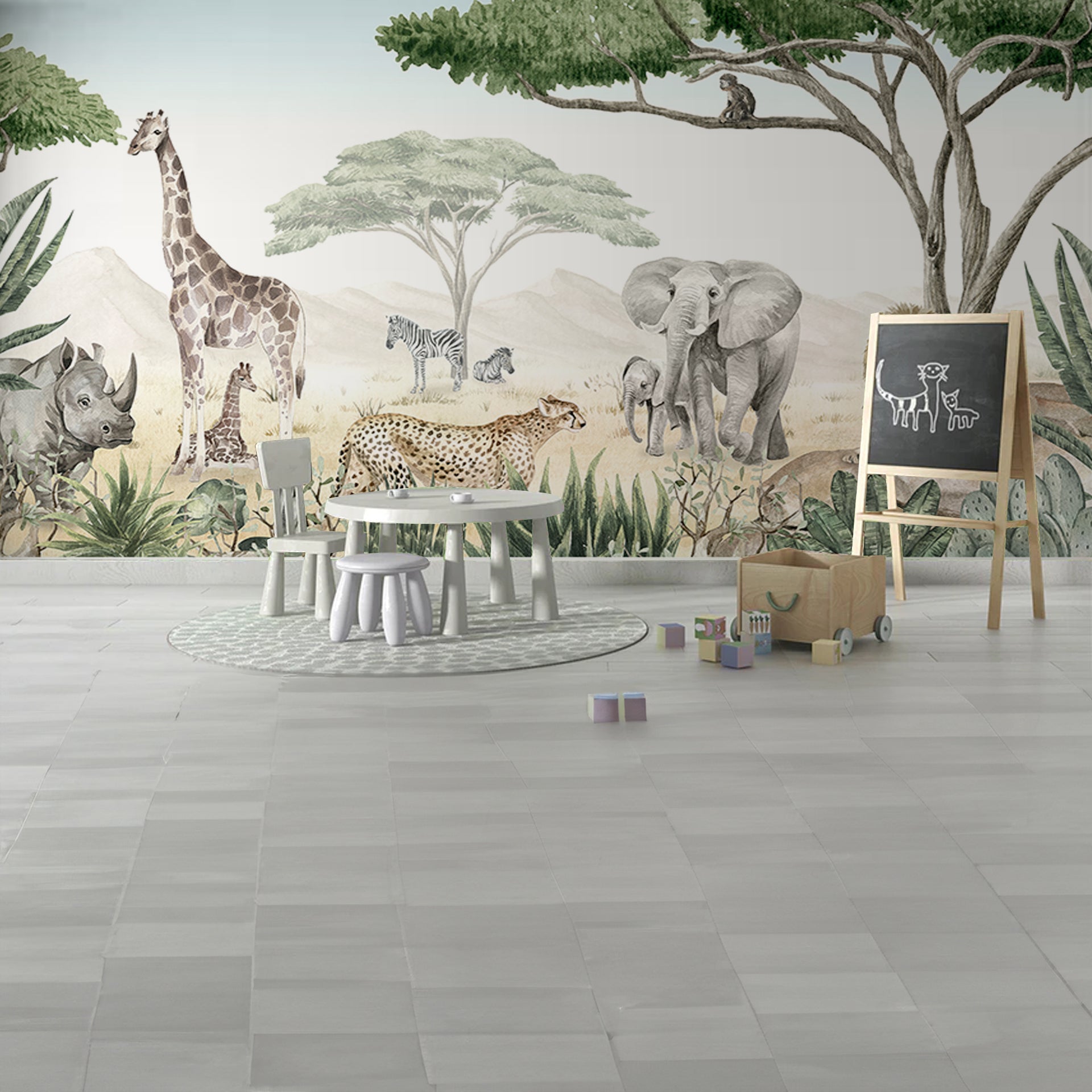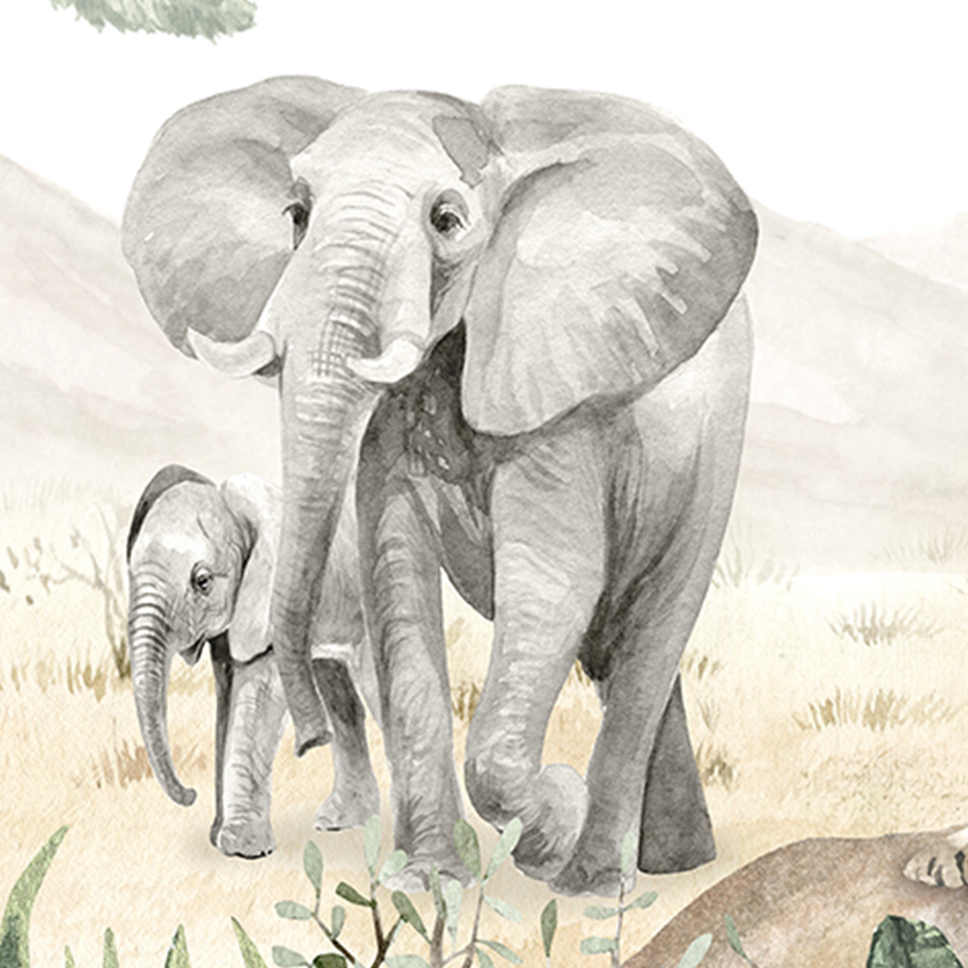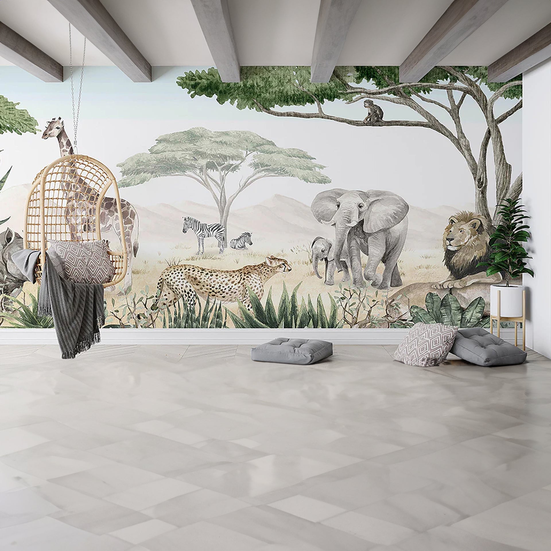 Savannah-Jive:Wildlife Wallpaper With Giraffes, Lions, Elephants, Zebras, and Monkeys in a Lush Landscape-Sample