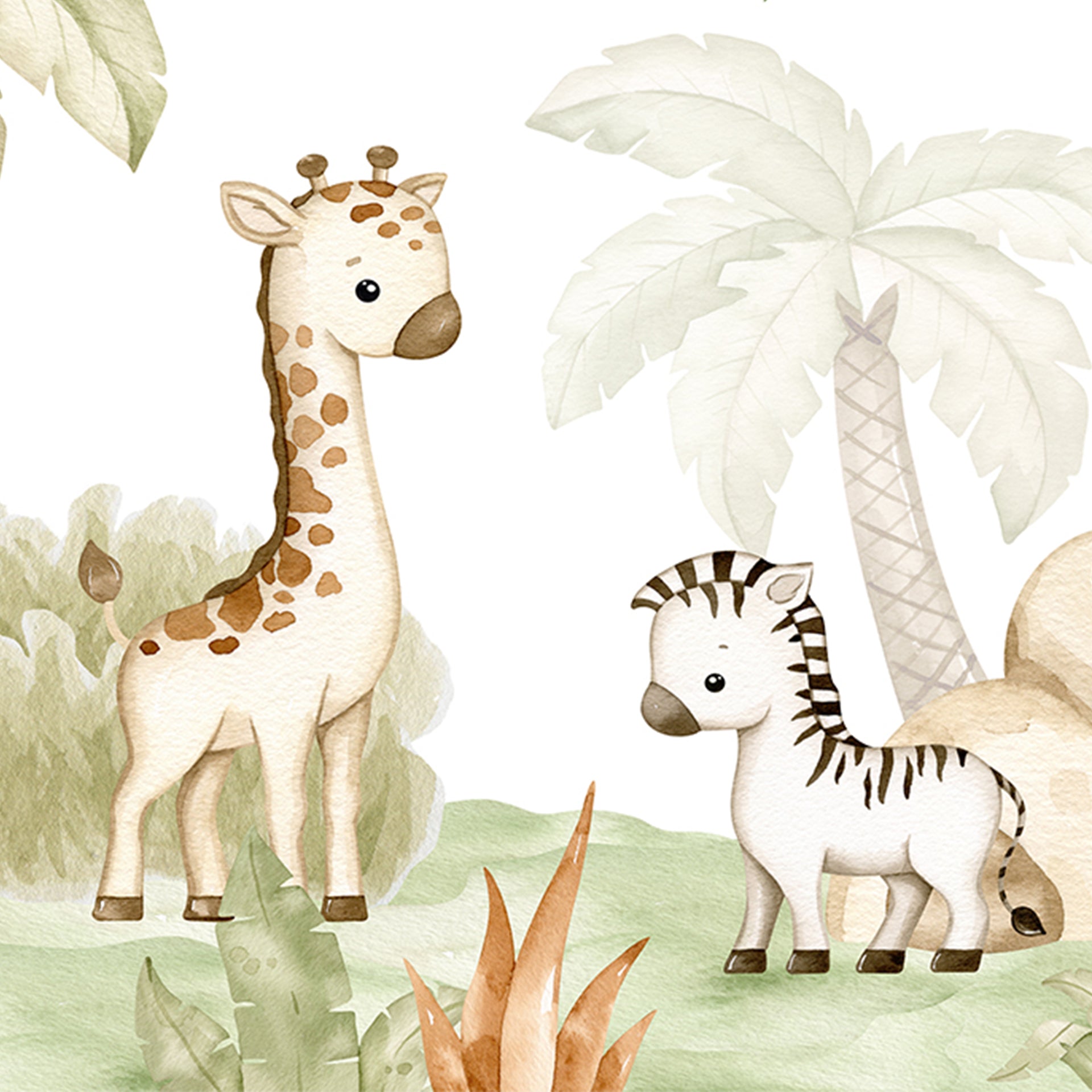 Charming watercolor illustration of a playful jungle gathering featuring a tiger, elephant, giraffe, zebra, lion, panda, and cheerful monkeys among palm trees and rocks. Perfect for children's books, decor, and learning materials.