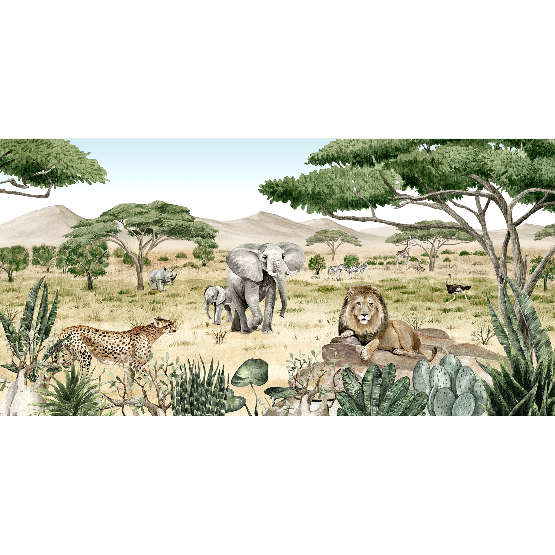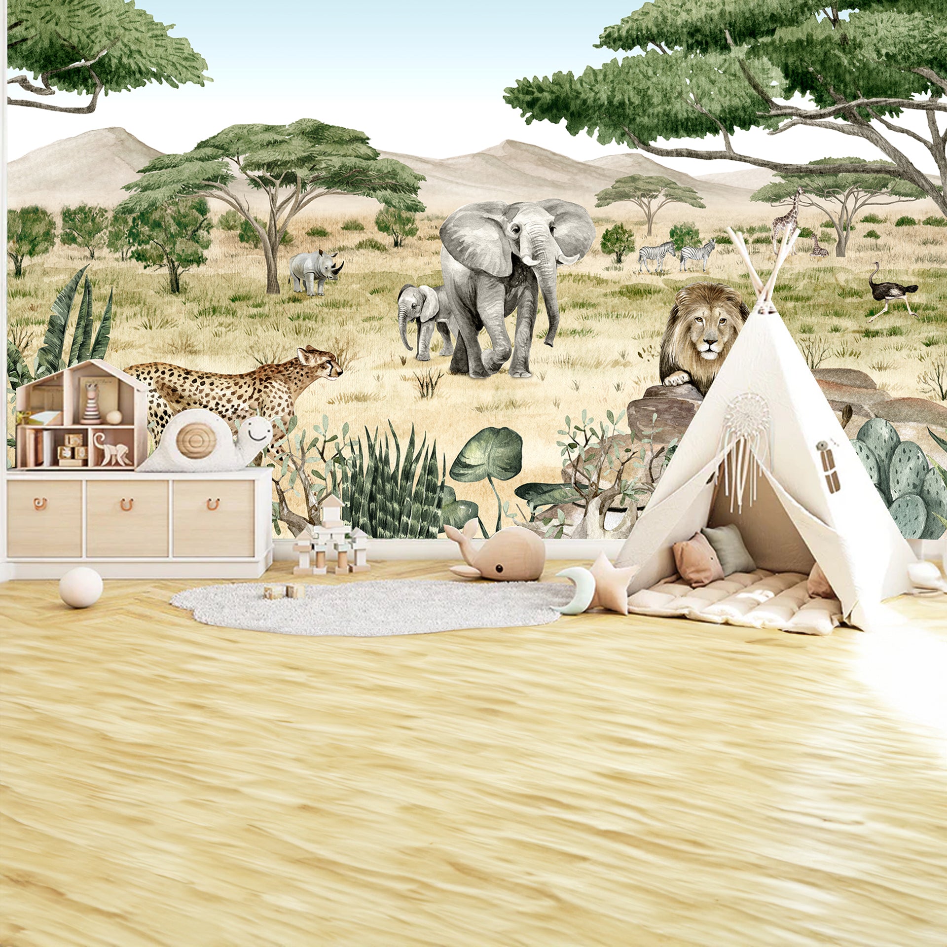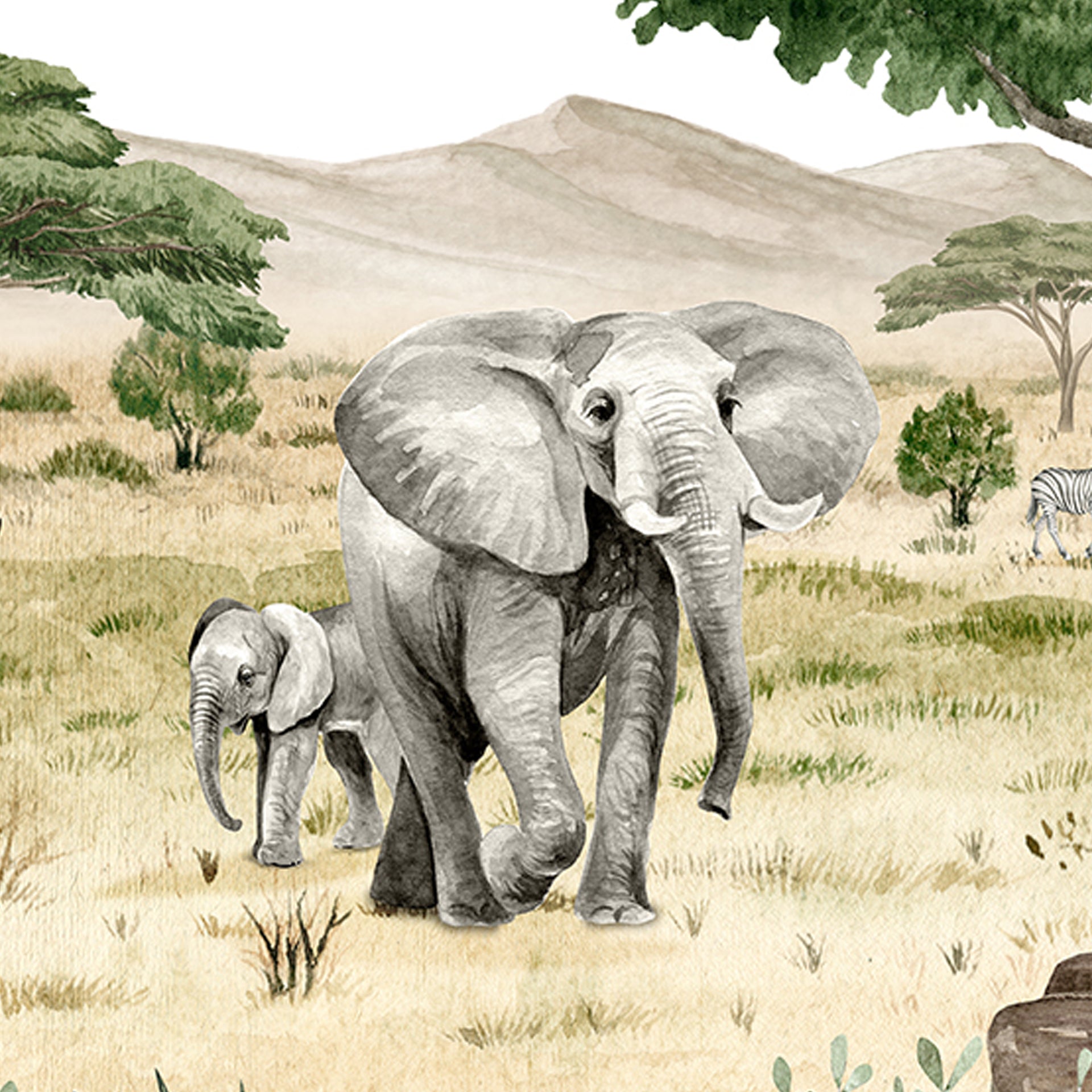 Savannah-Secrets:Watercolor Wallpaper With Elephant, Lion, Cheetah, Giraffe, and Zebra In Panoramic Landscape-Sample