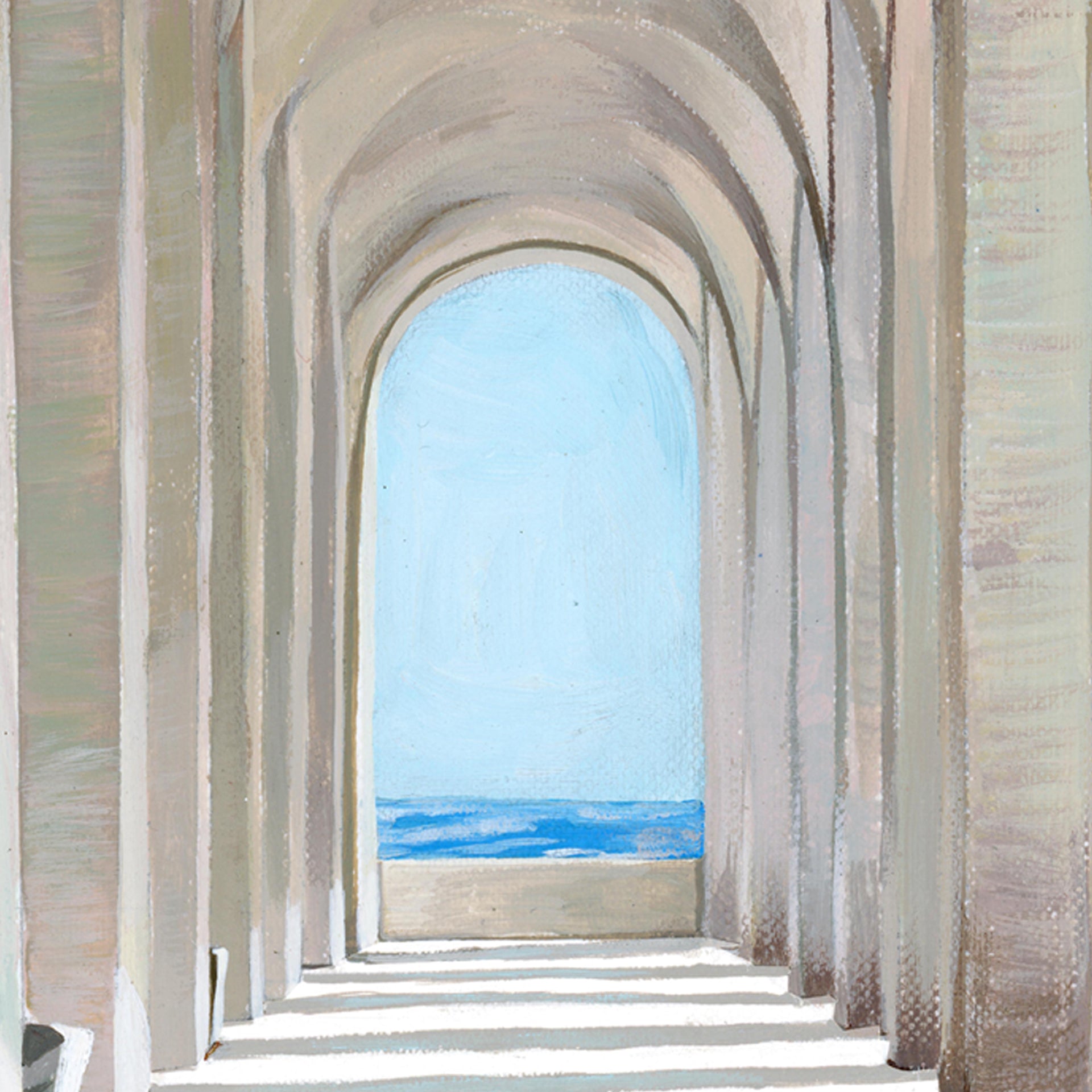 A tranquil scene of sunlit archways leading to a view of the ocean, invoking feelings of peace and infinity.