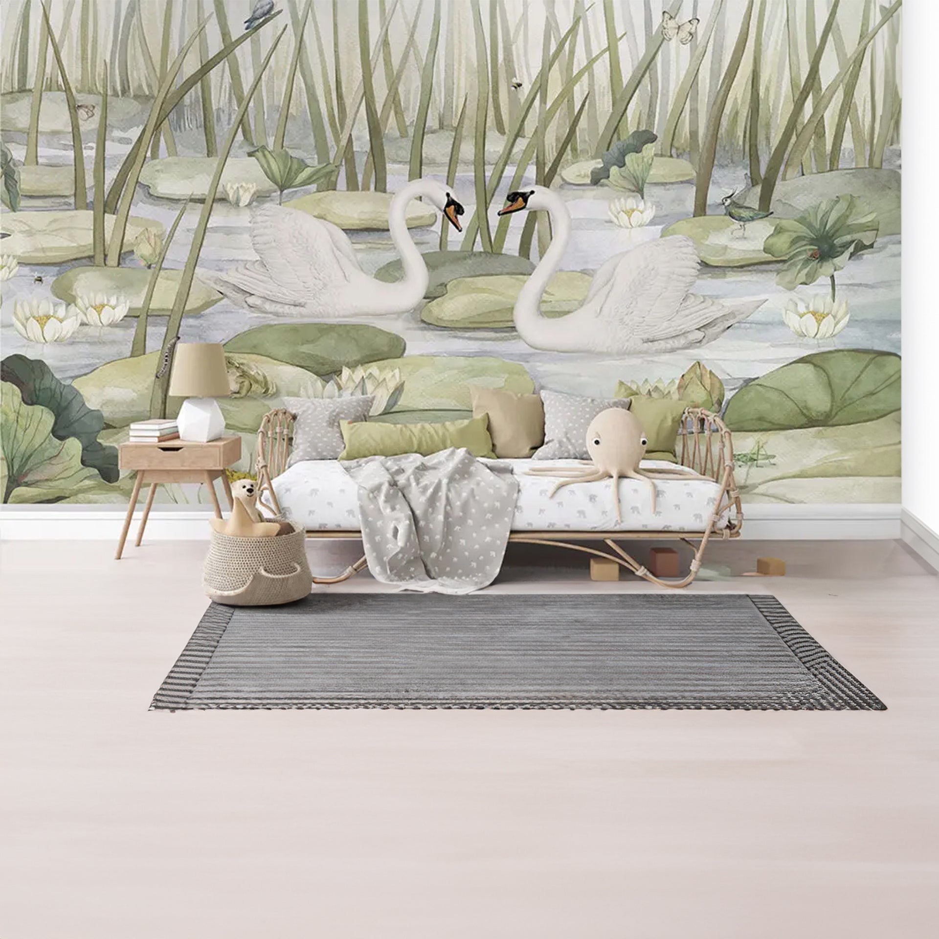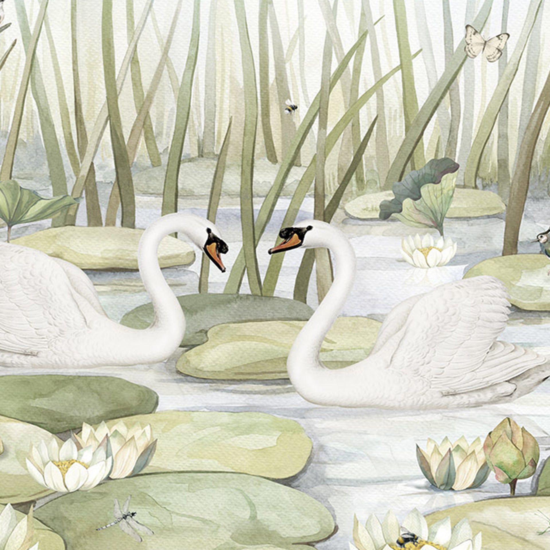 A peaceful watercolor scene features two white swans on a tranquil pond, surrounded by tall reeds, lily pads, and blooming water lilies. Small birds, frogs, and dragonflies add gentle life to the landscape.