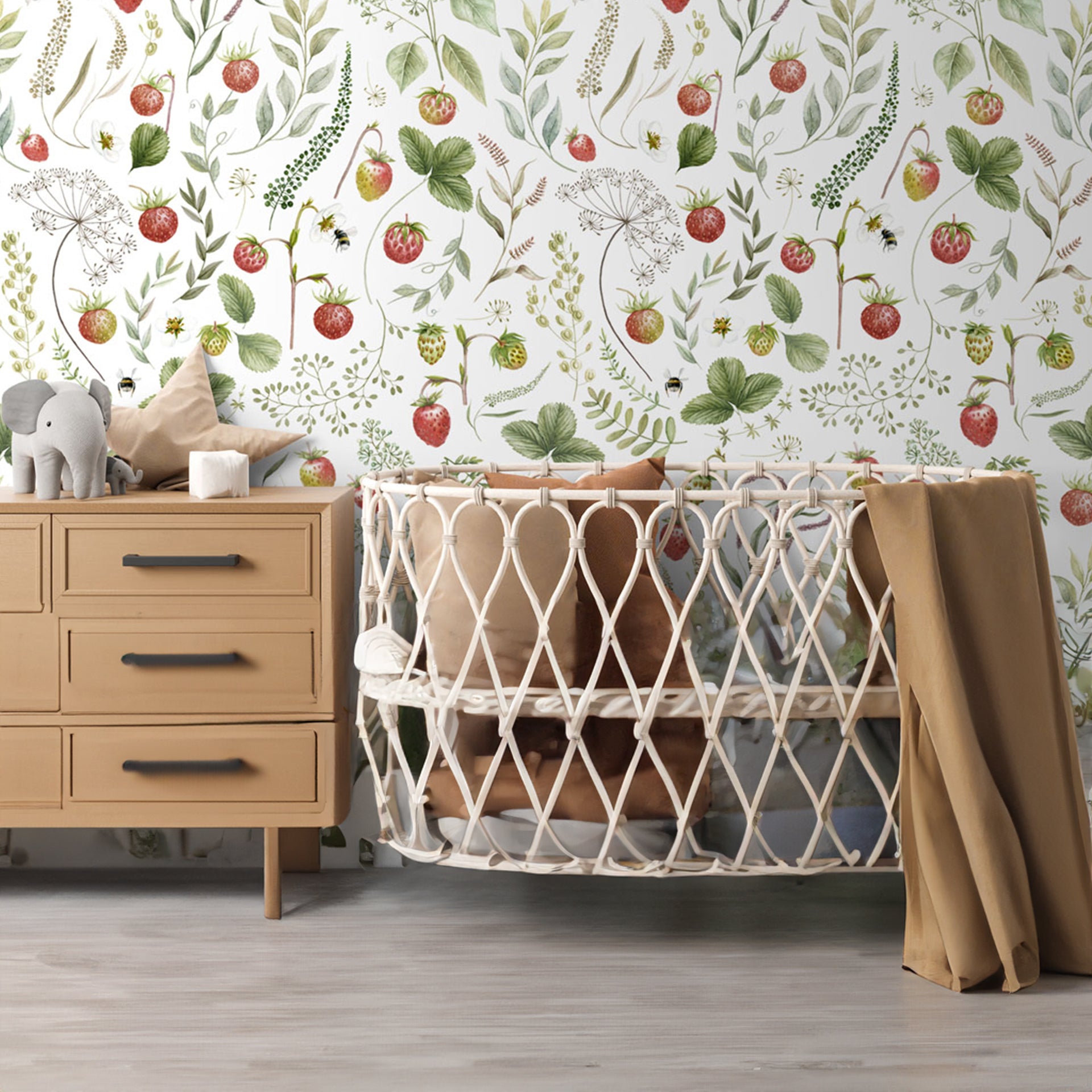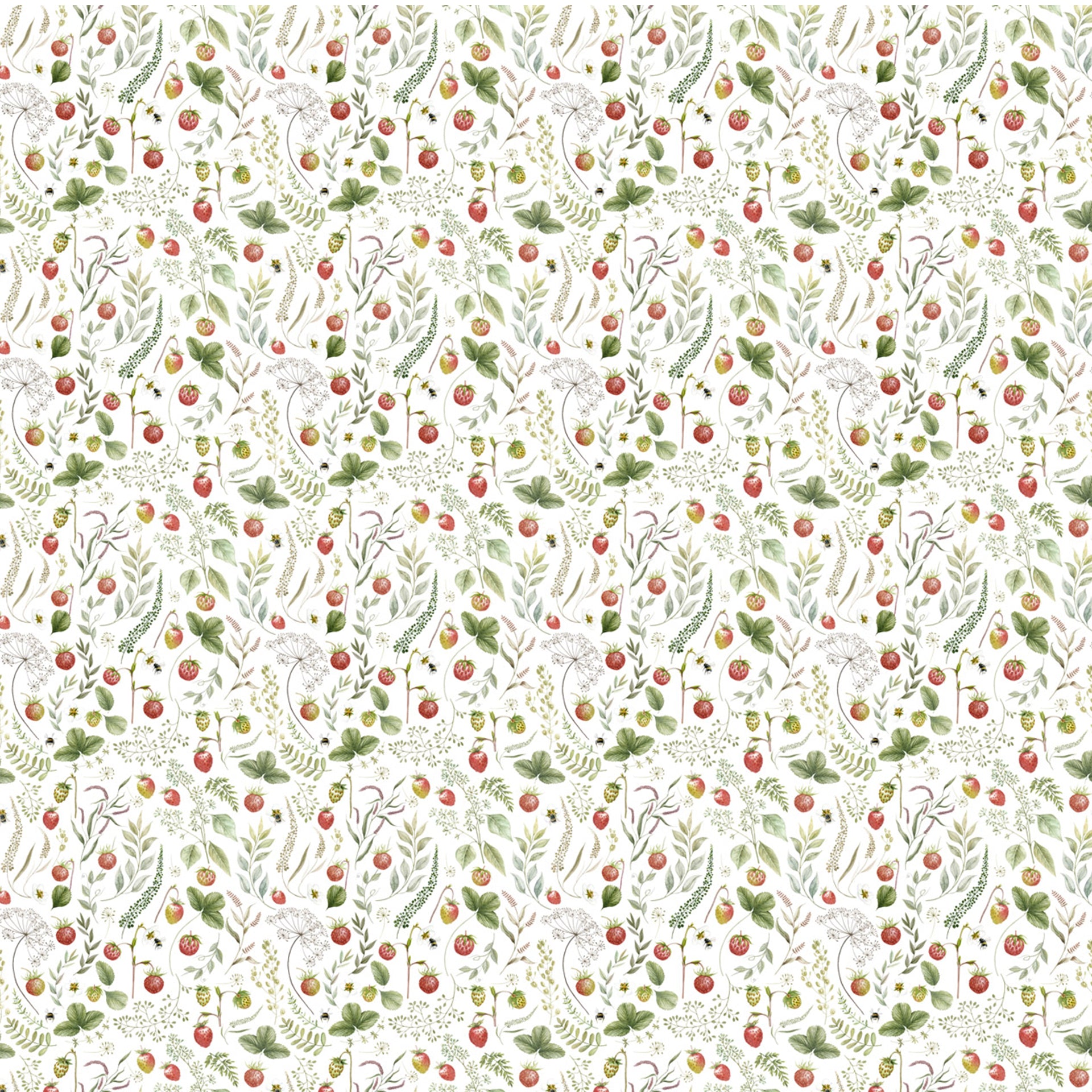 Vibrant botanical repeating pattern featuring delicate leaves, tiny blossoms, and ripened red berries. Ideal for fabric, wallpaper, stationery, or home decor, evoking fresh garden-inspired style and natural calm.