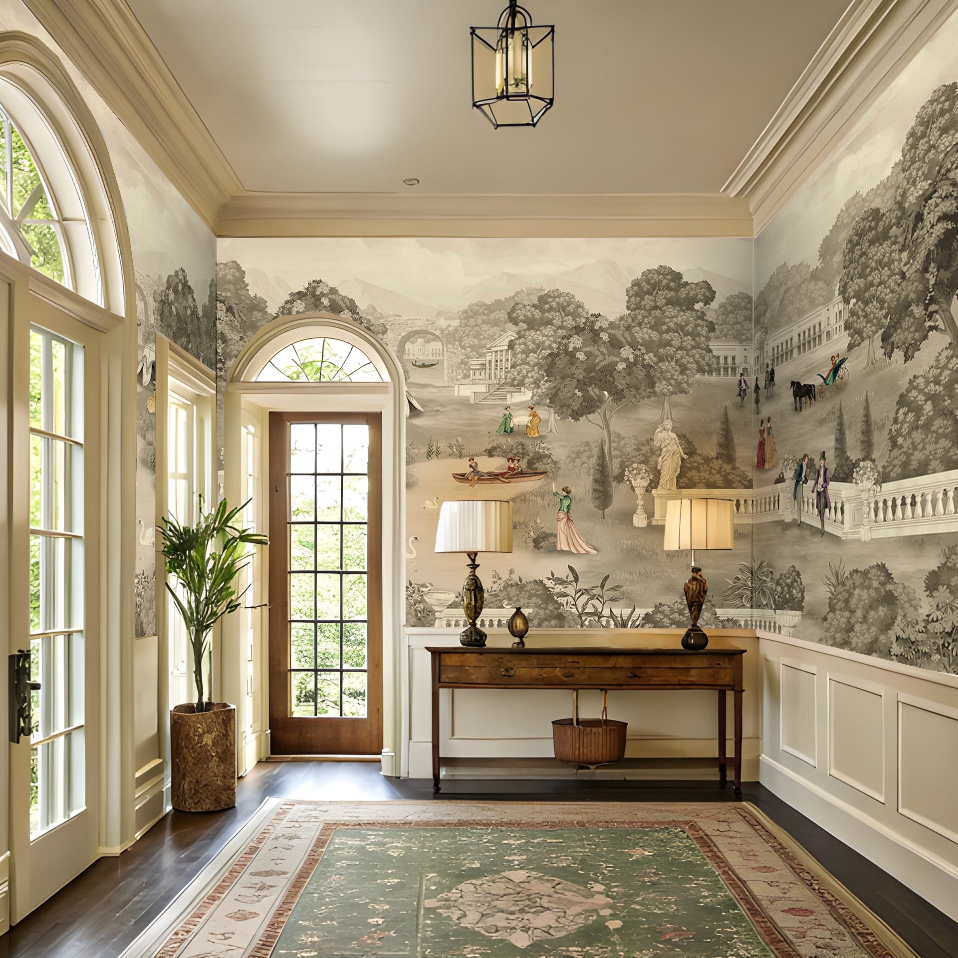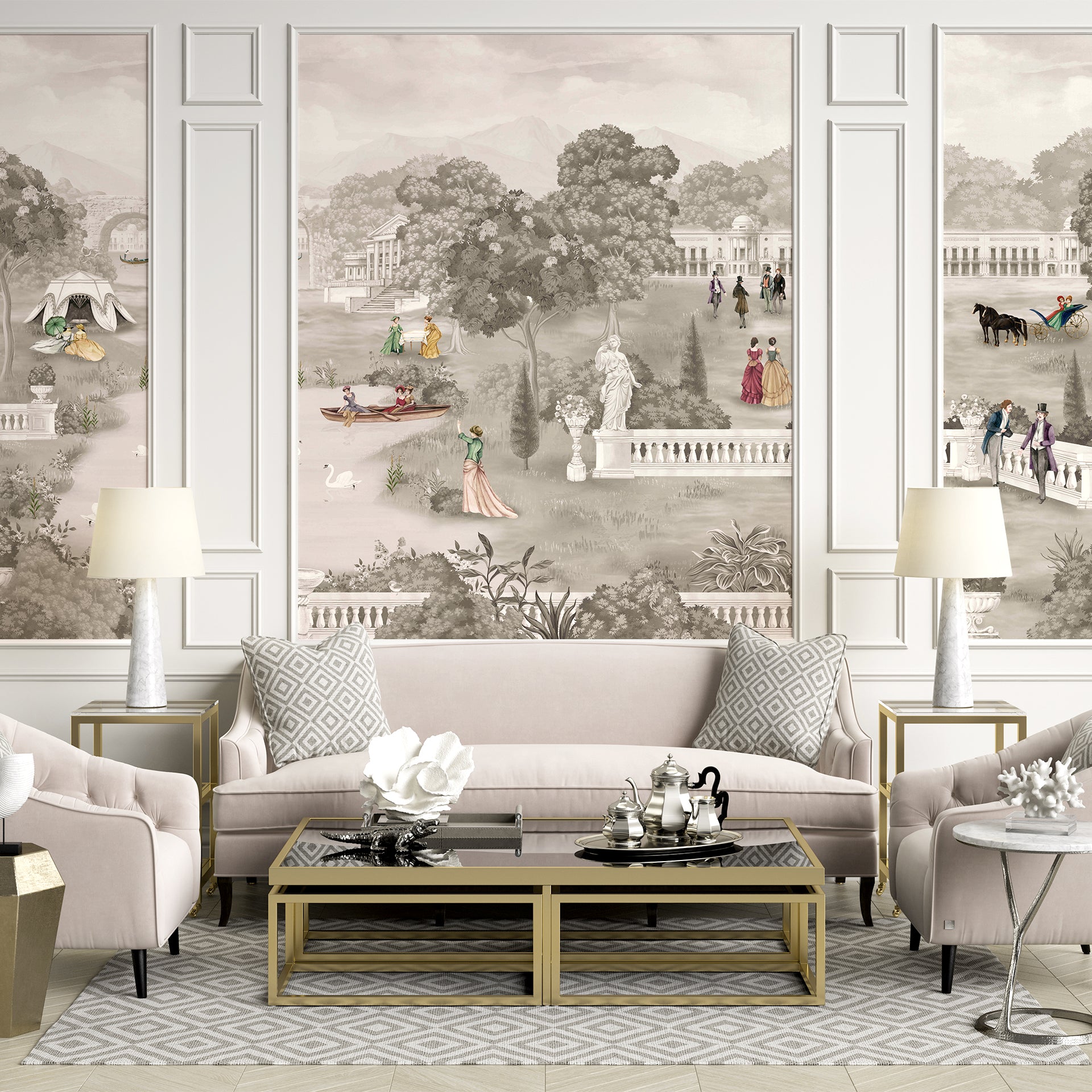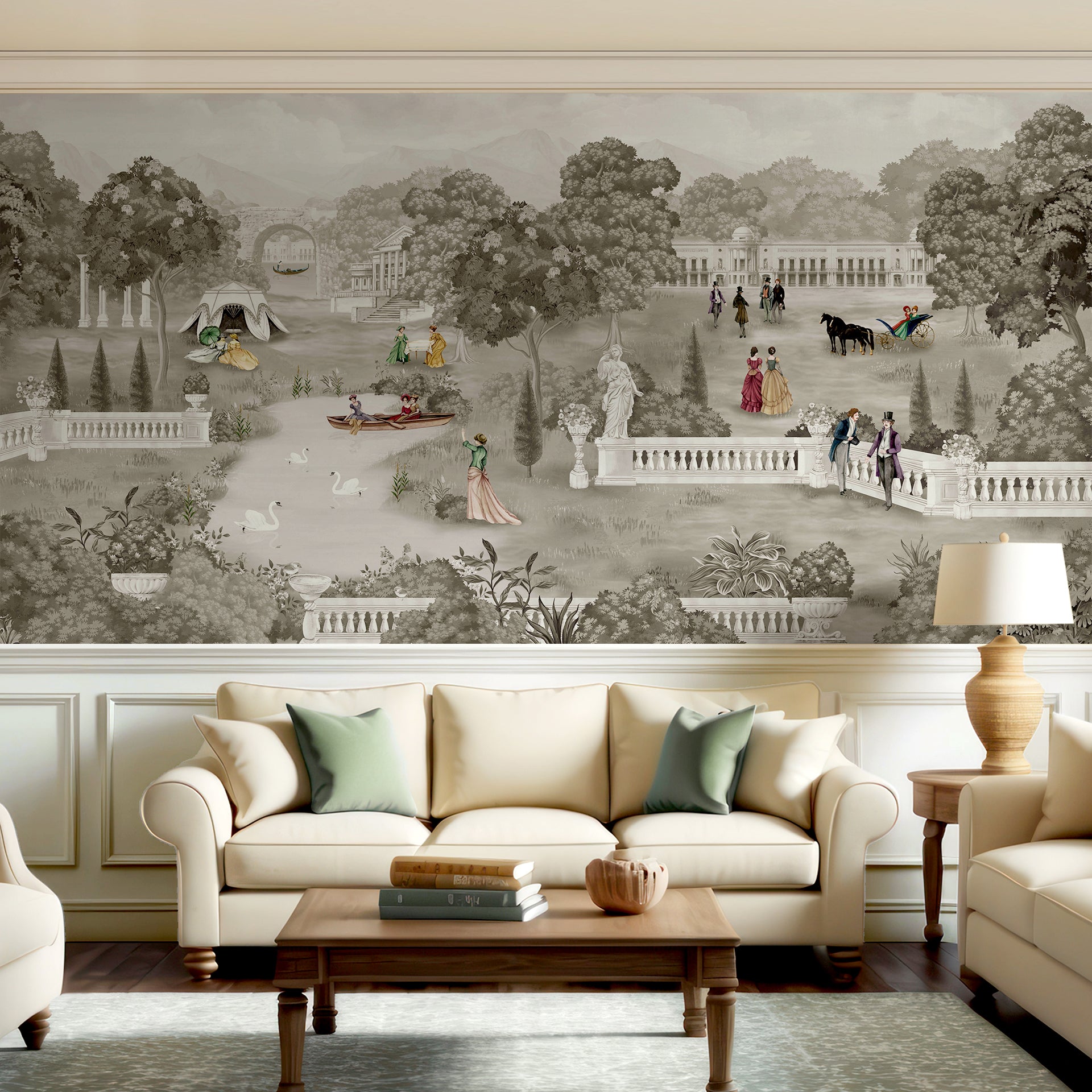 Summer Palace Sepia: Illustration of People in a Historical Garden Landscape With Statues and Carriages- Sample