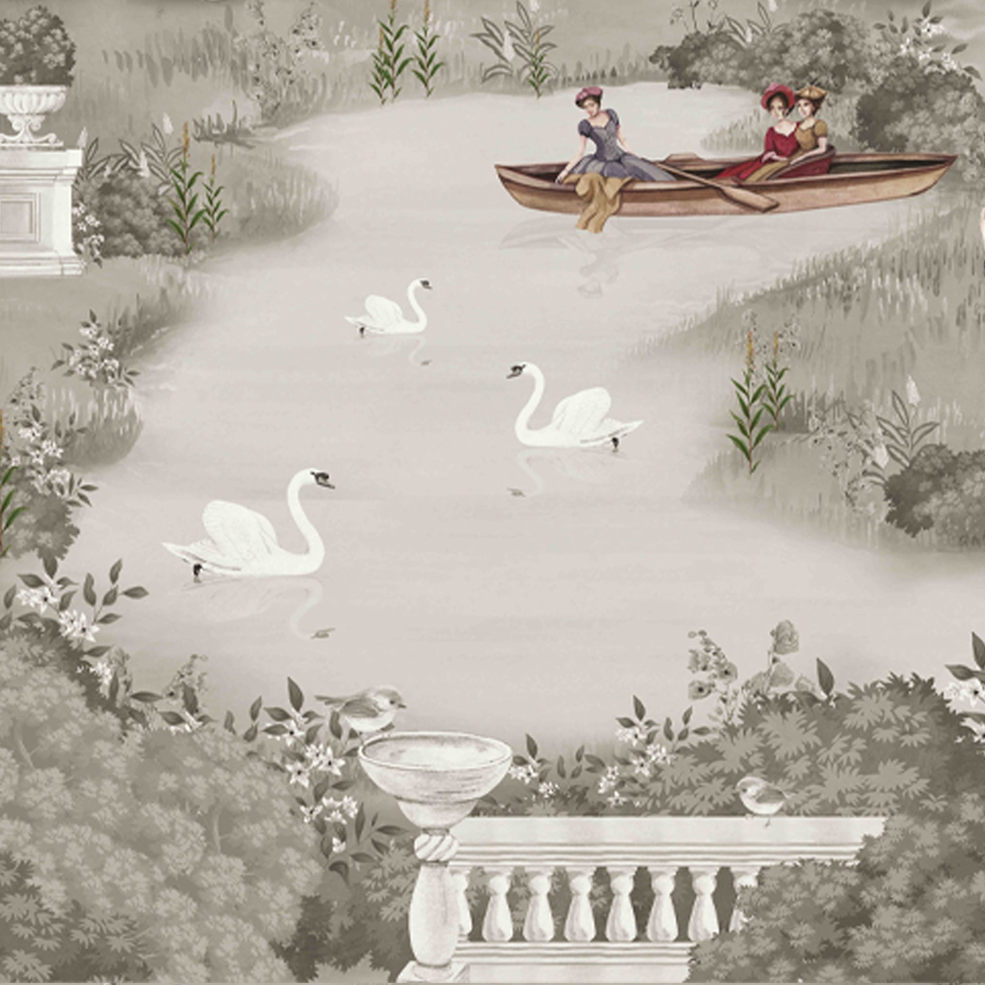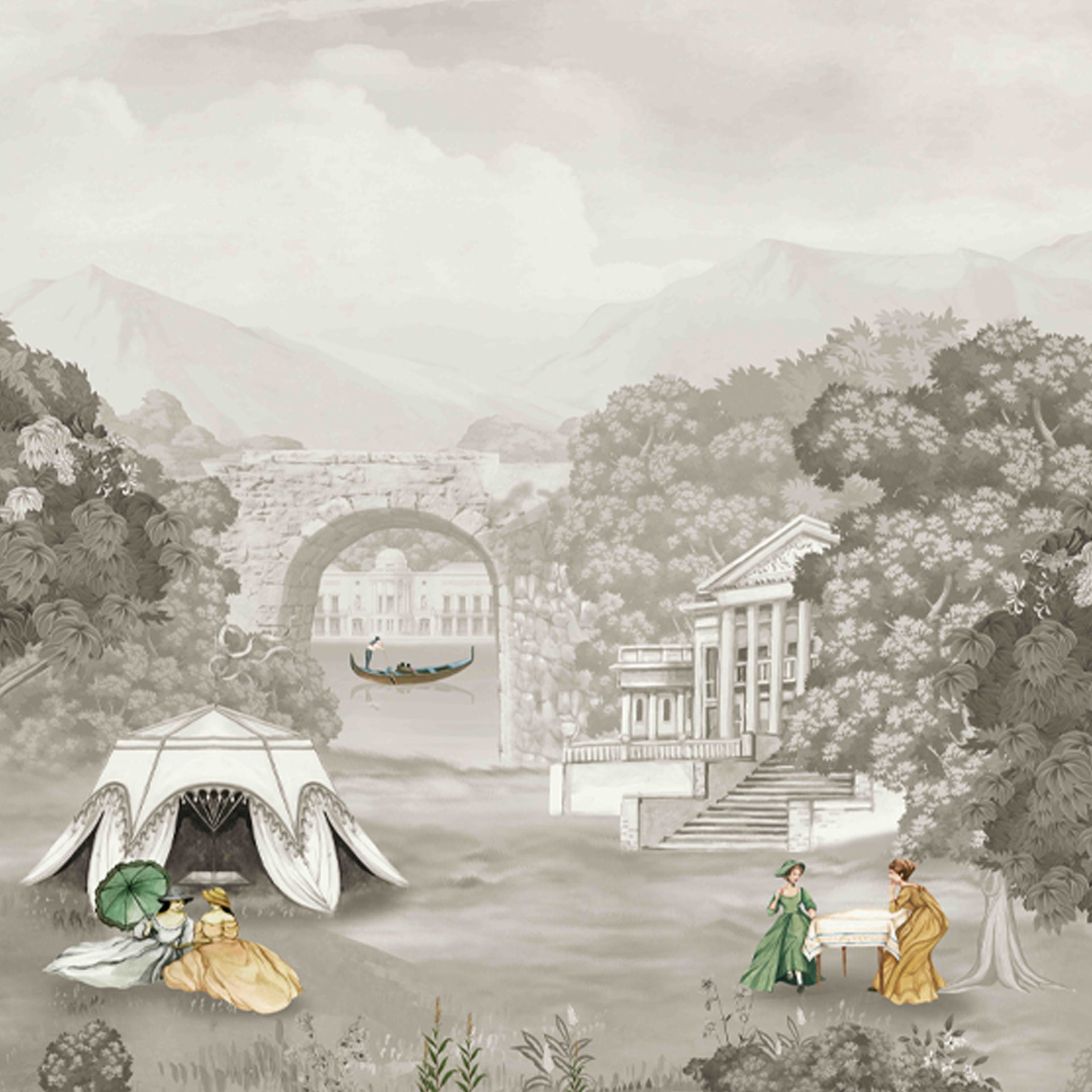 Vintage styled illustrated scene depicting a peaceful garden with people in colorful dresses and elegant structures, featuring historical details, lush greenery, and serene activities.