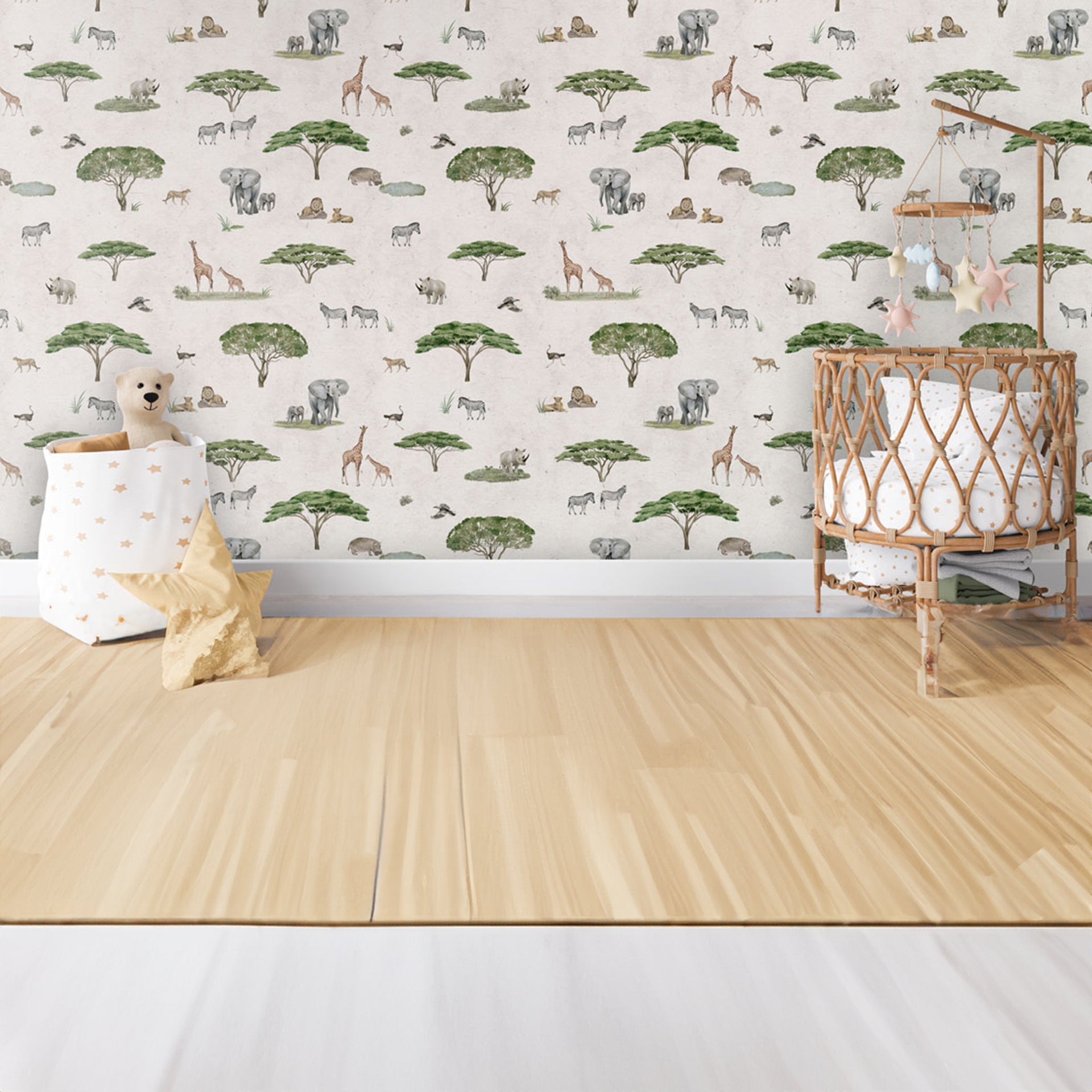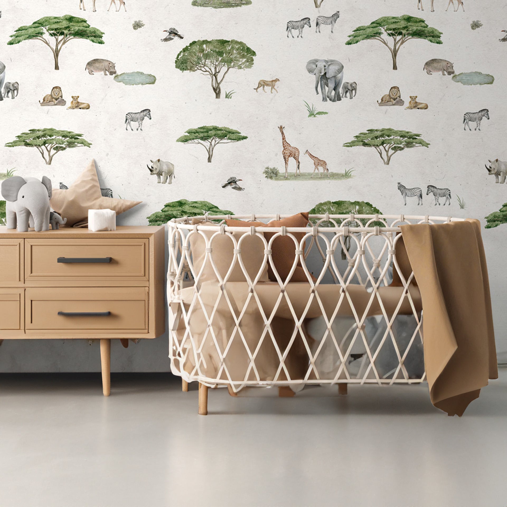 A seamless wildlife pattern featuring savanna icons like elephants, giraffes, and acacia trees. Ideal for textiles, wallpaper, or decor with a calm, safari-inspired vibe.