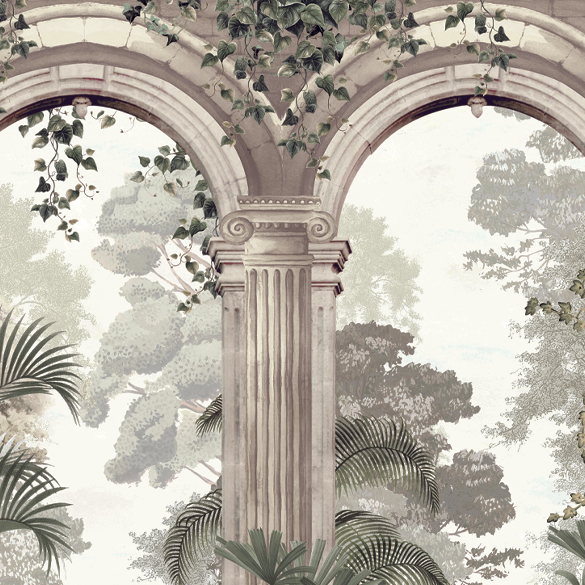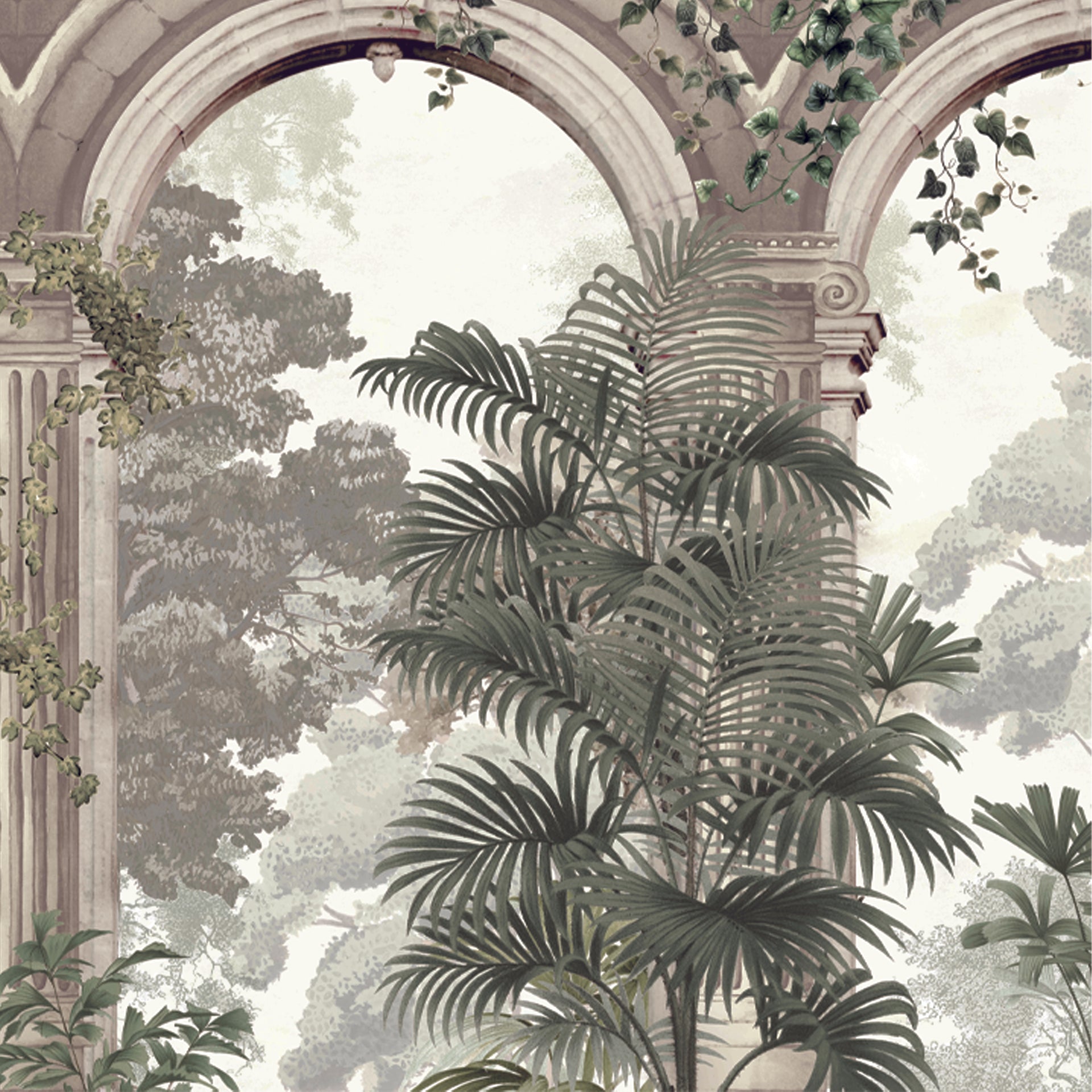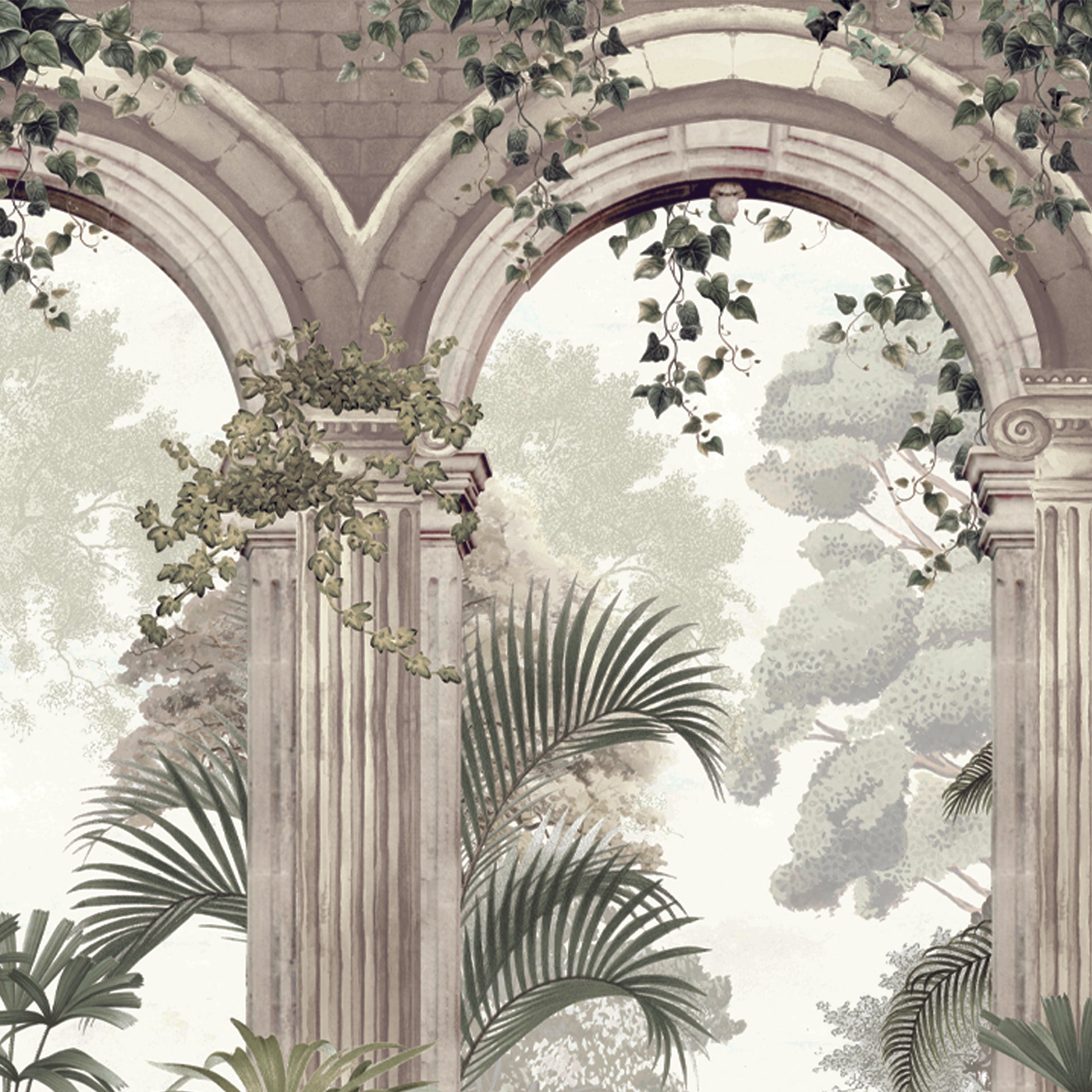 Tangled in Time: Classical Stone Arches Amidst Lush Greenery and Tropical Foliage- Sample
