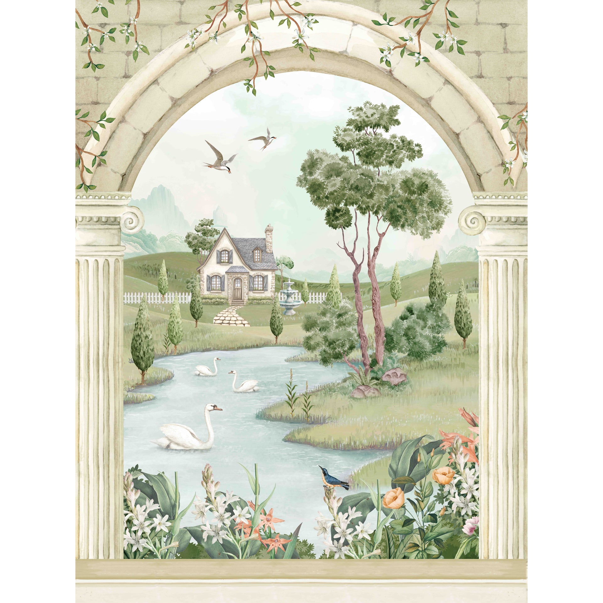 Charming scene depicting a cozy countryside cottage, a serene pond with swans, and vibrant flowers. Framed by an archway, this idyllic image conveys tranquility and the beauty of rural nature.