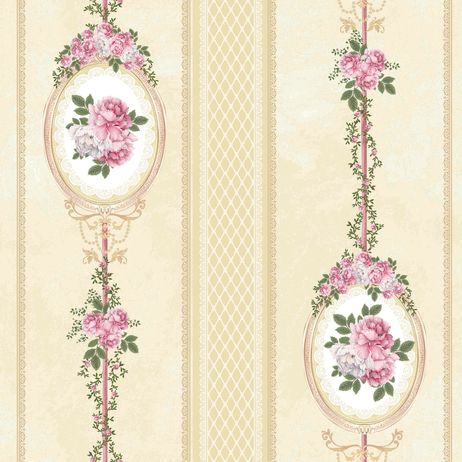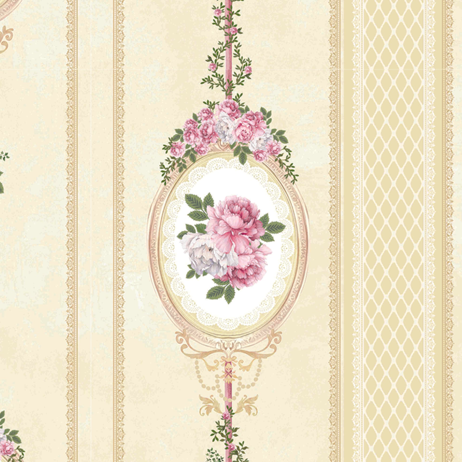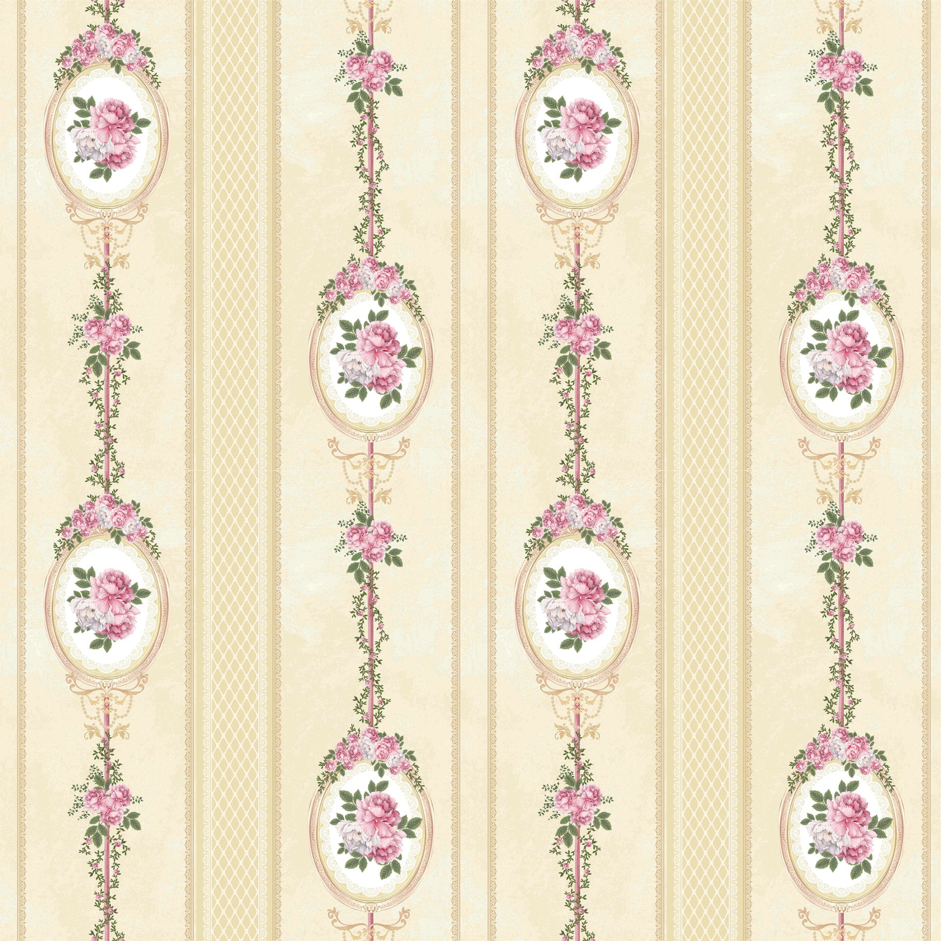 Delicate vintage wallpaper showcasing ornate pink roses within elegant ovals against a warm, soft background, creating a timeless and sophisticated decorative style for any classic interior design project.