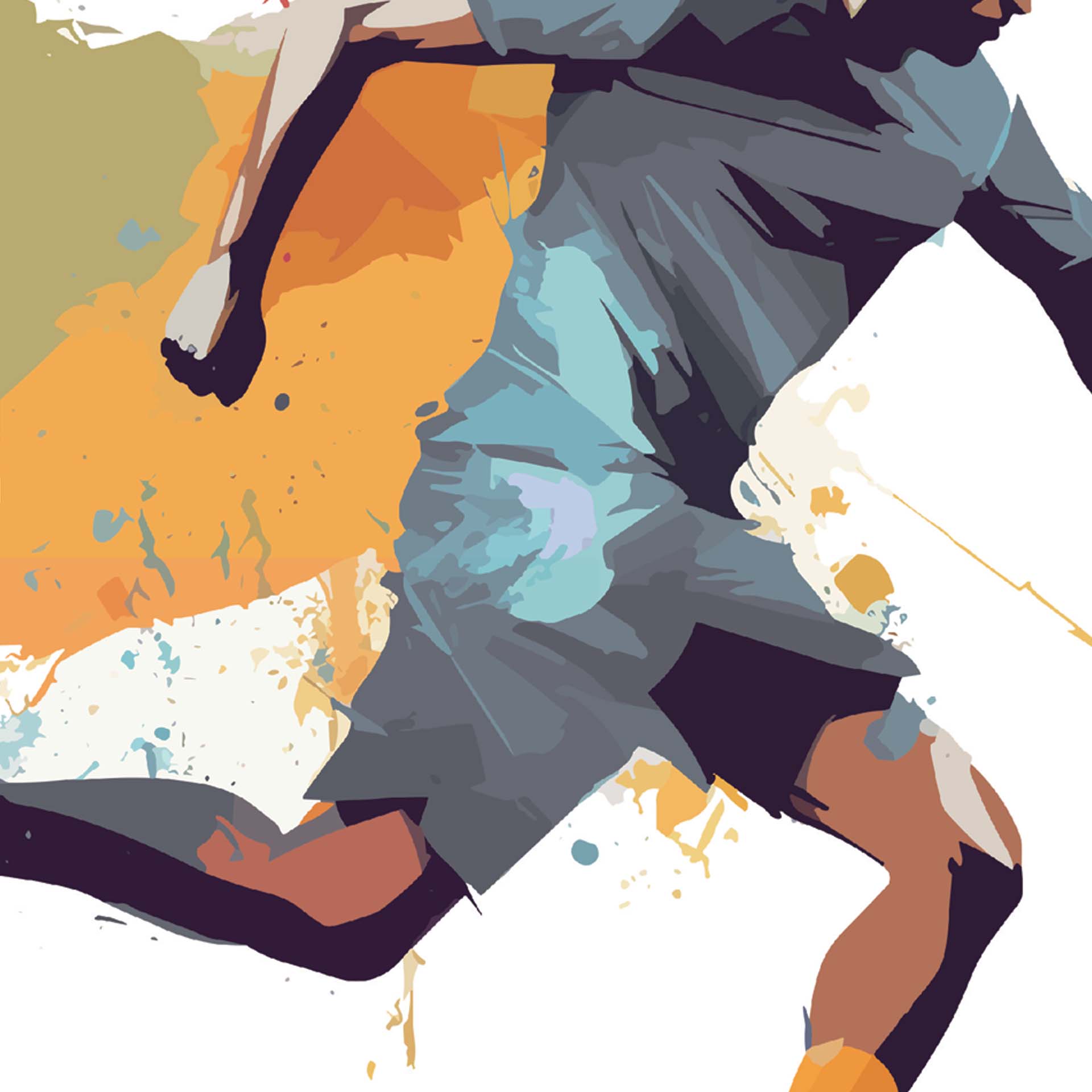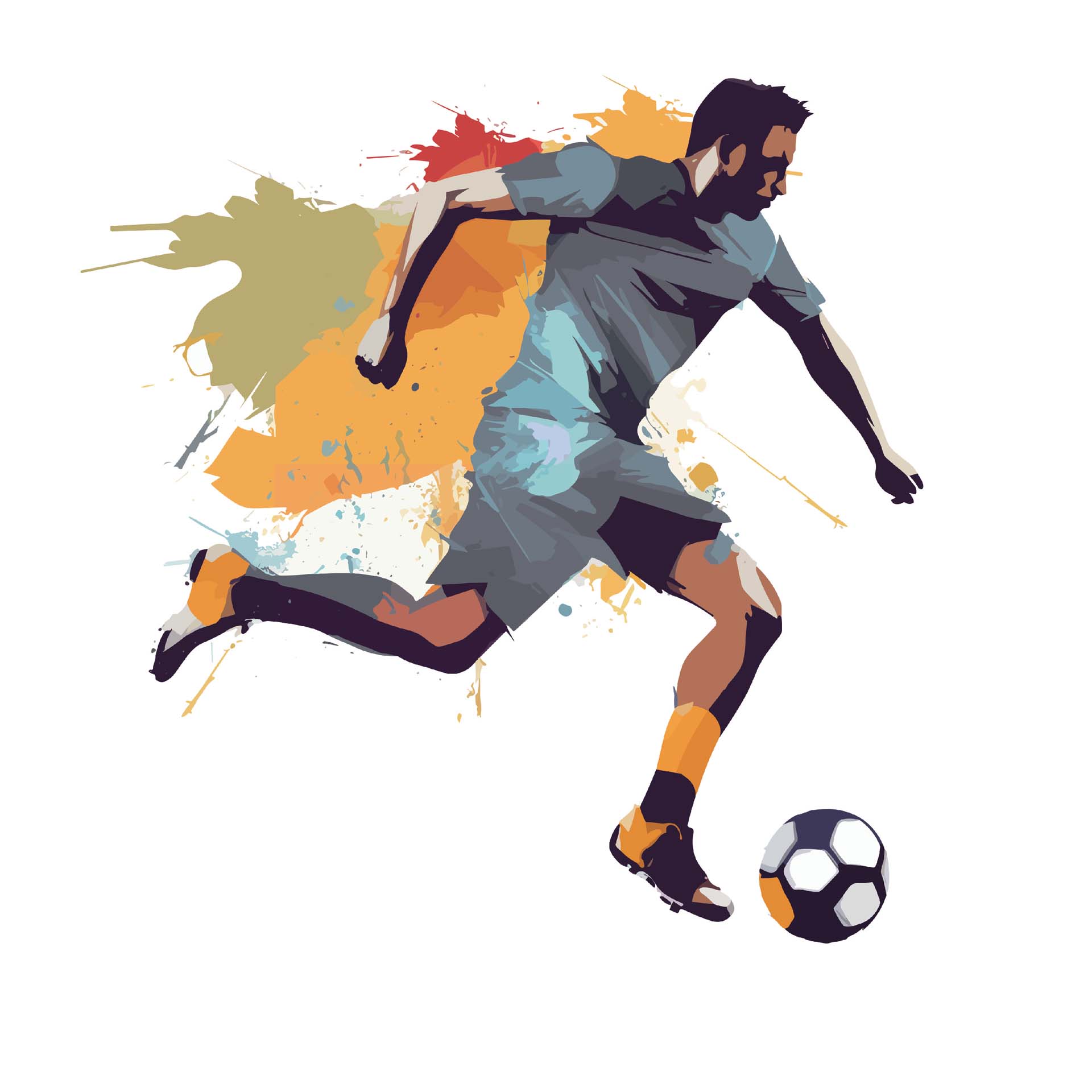 Dynamic digital illustration of a soccer player in action, surrounded by vibrant splashes of colors, capturing the energy and spirit of the game, perfect for emphasizing athleticism and competitive enthusiasm.