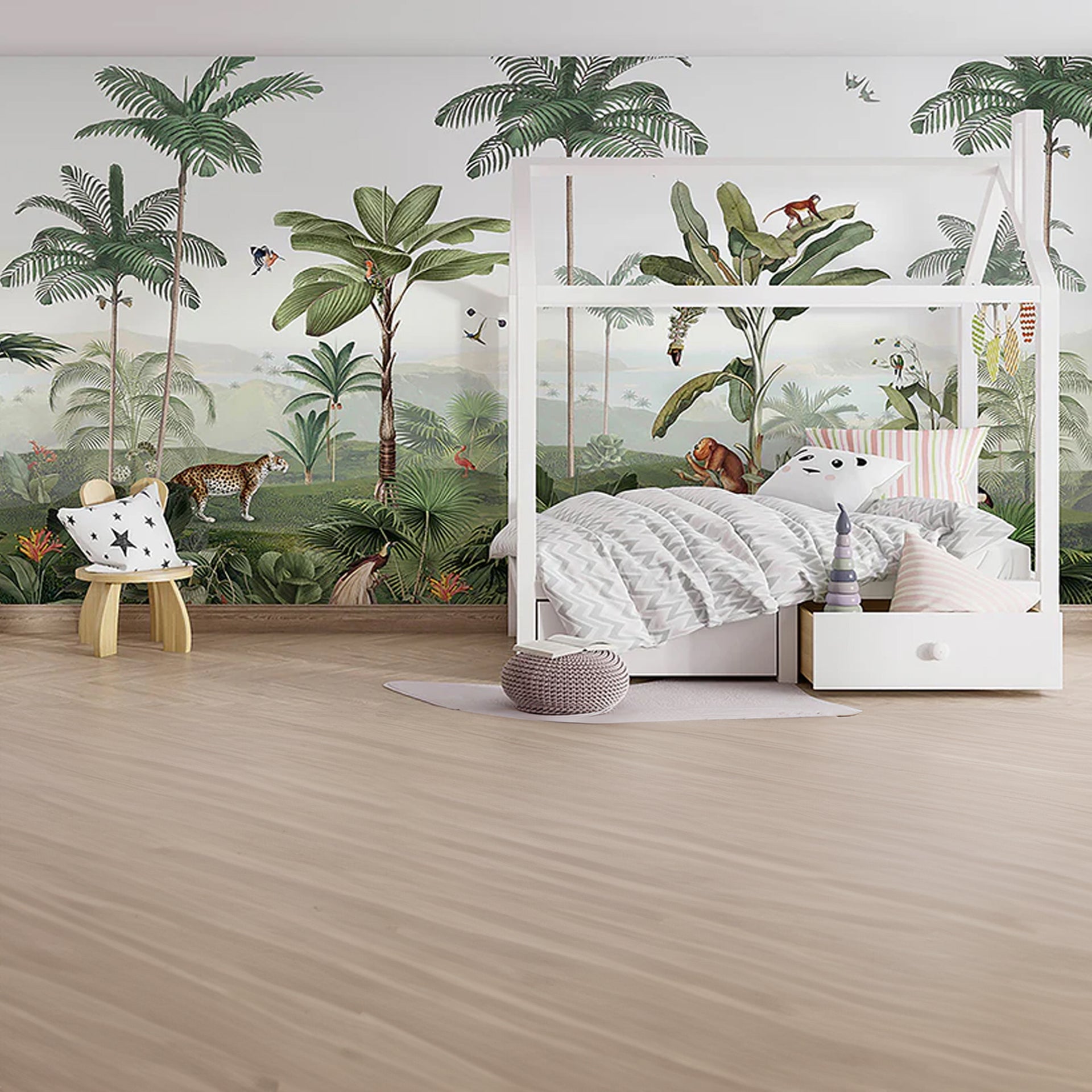 Thrilling-Tropics: Tropical Jungle Wallpaper With Palm Trees, Monkeys, Birds, in a Rainforest-Sample