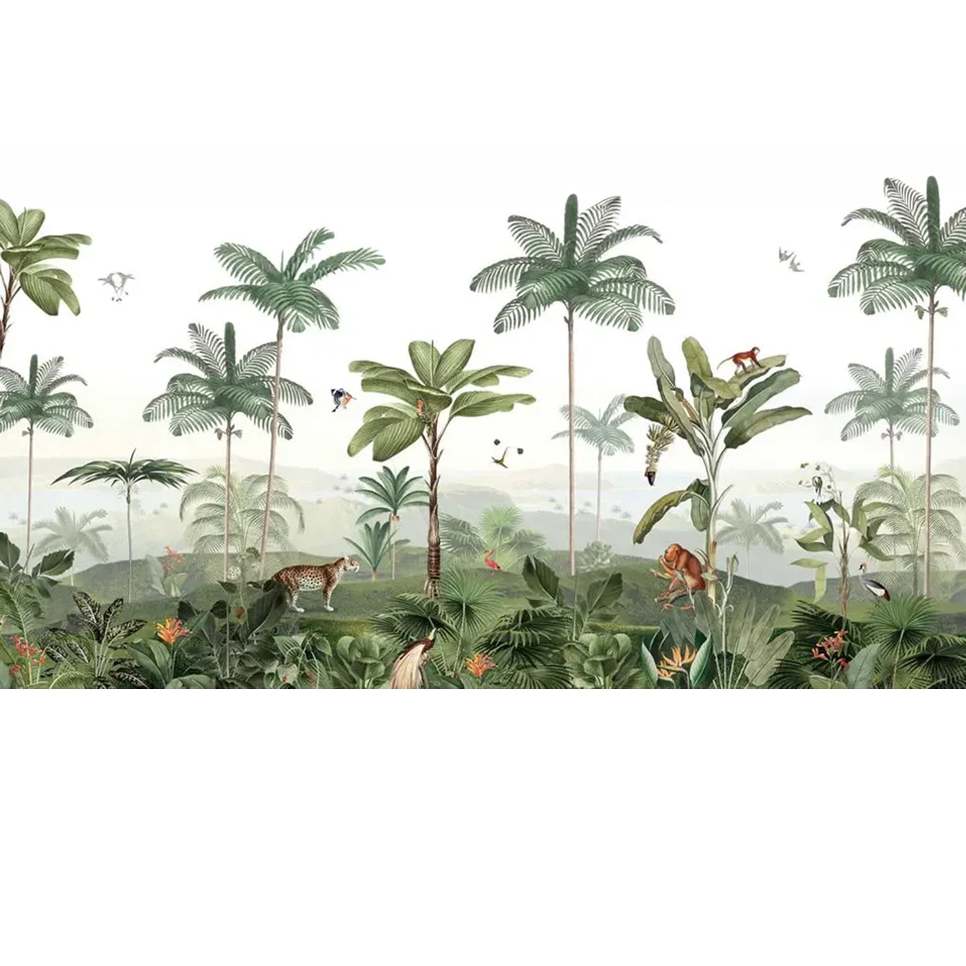 A vibrant tropical jungle panorama featuring tall palm trees, dense foliage, and playful monkeys amid birds and tropical plants. Ideal for nature, travel, or adventure themes and lush green palettes.