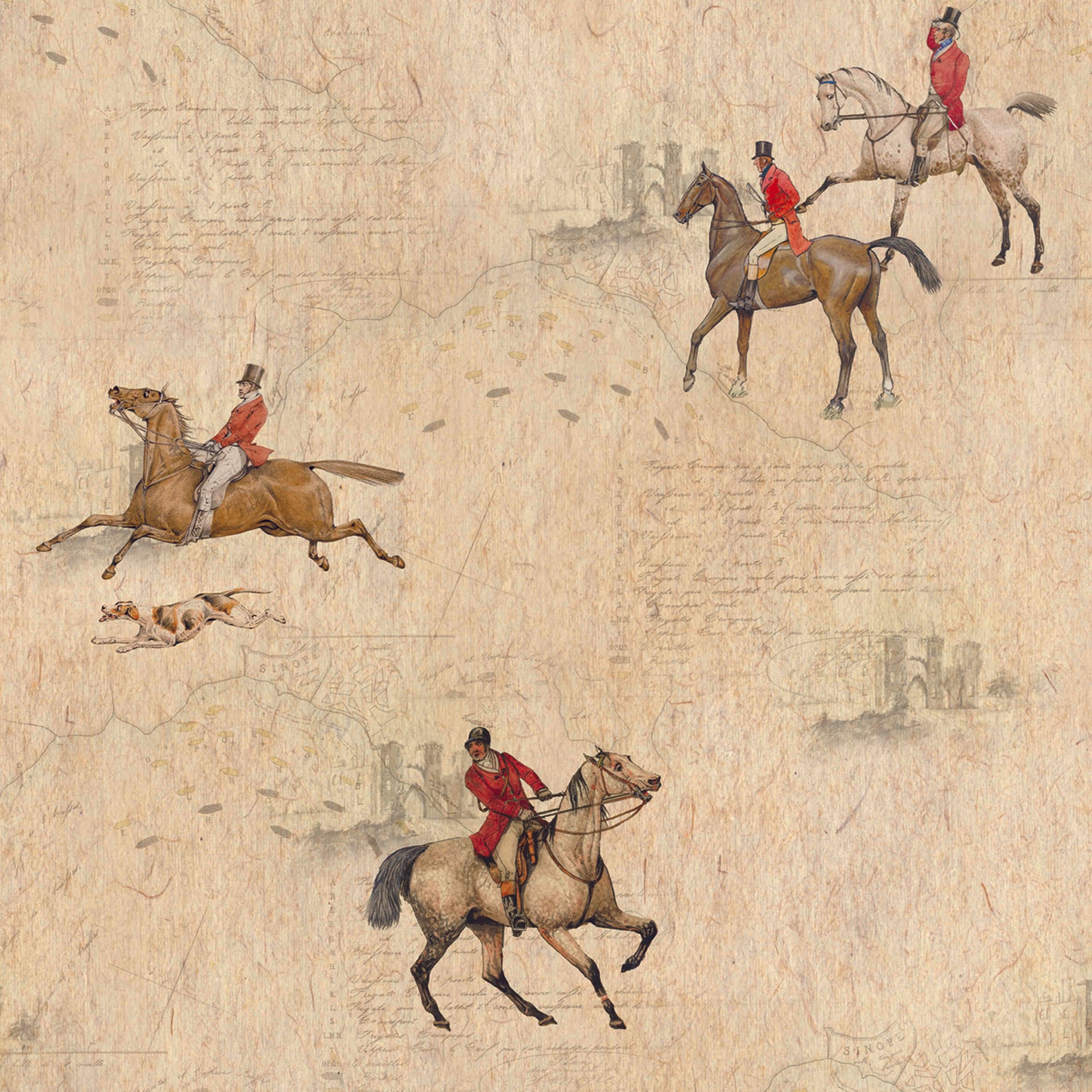 A vintage-style illustration showcasing riders on horses in a scenic pattern. Features a timeless design with muted hues, creating a classic and elegant equestrian theme.