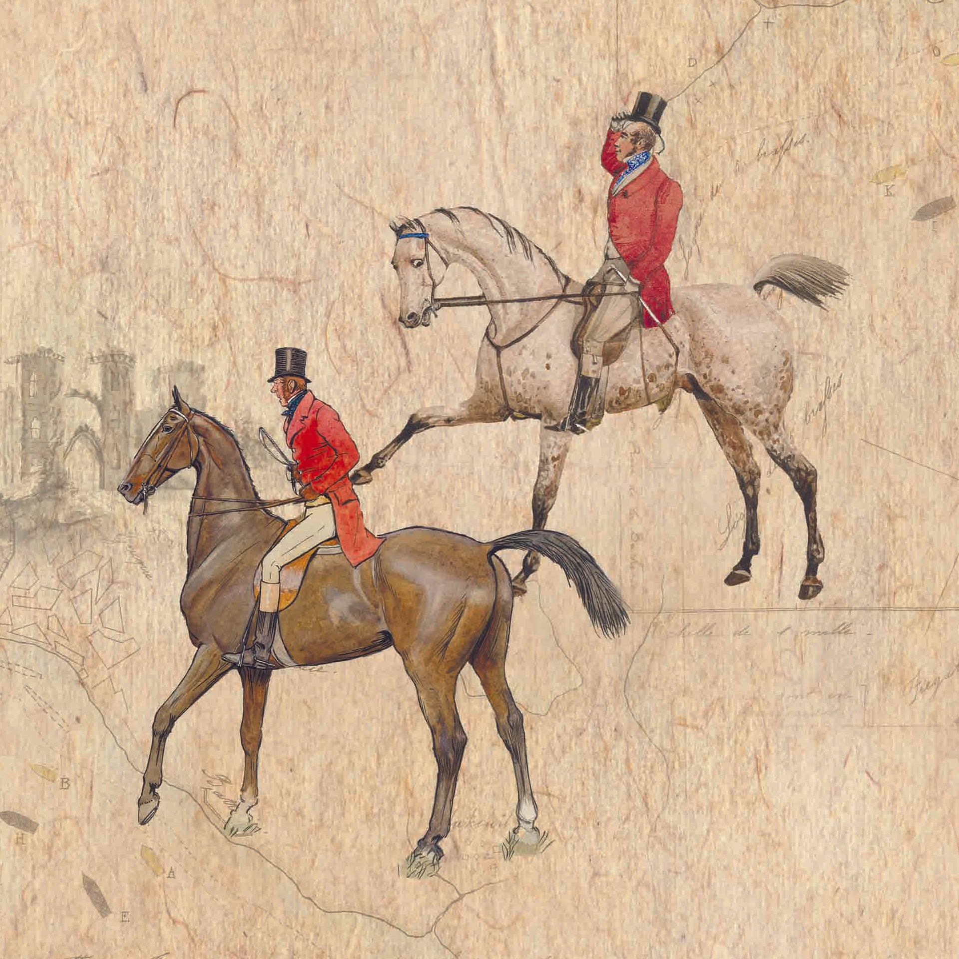 Through the Bridle Path: A vintage-inspired repeating pattern featuring English horse riders and equestrian details- Sample
