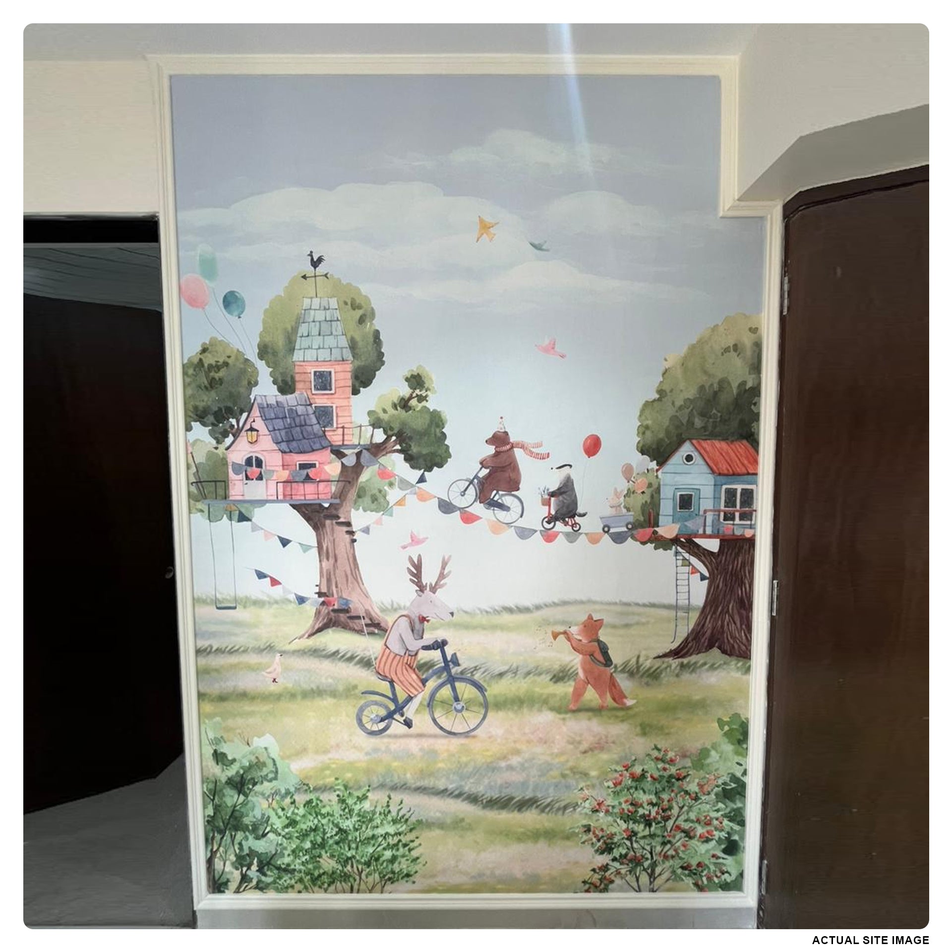Tree-House-Party: Whimsical wallpaper With Biking Friends, Balloons, and Playful Animals-Sample