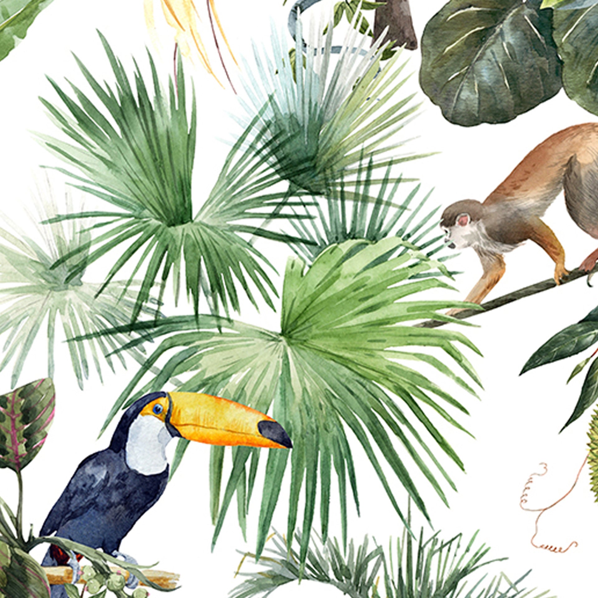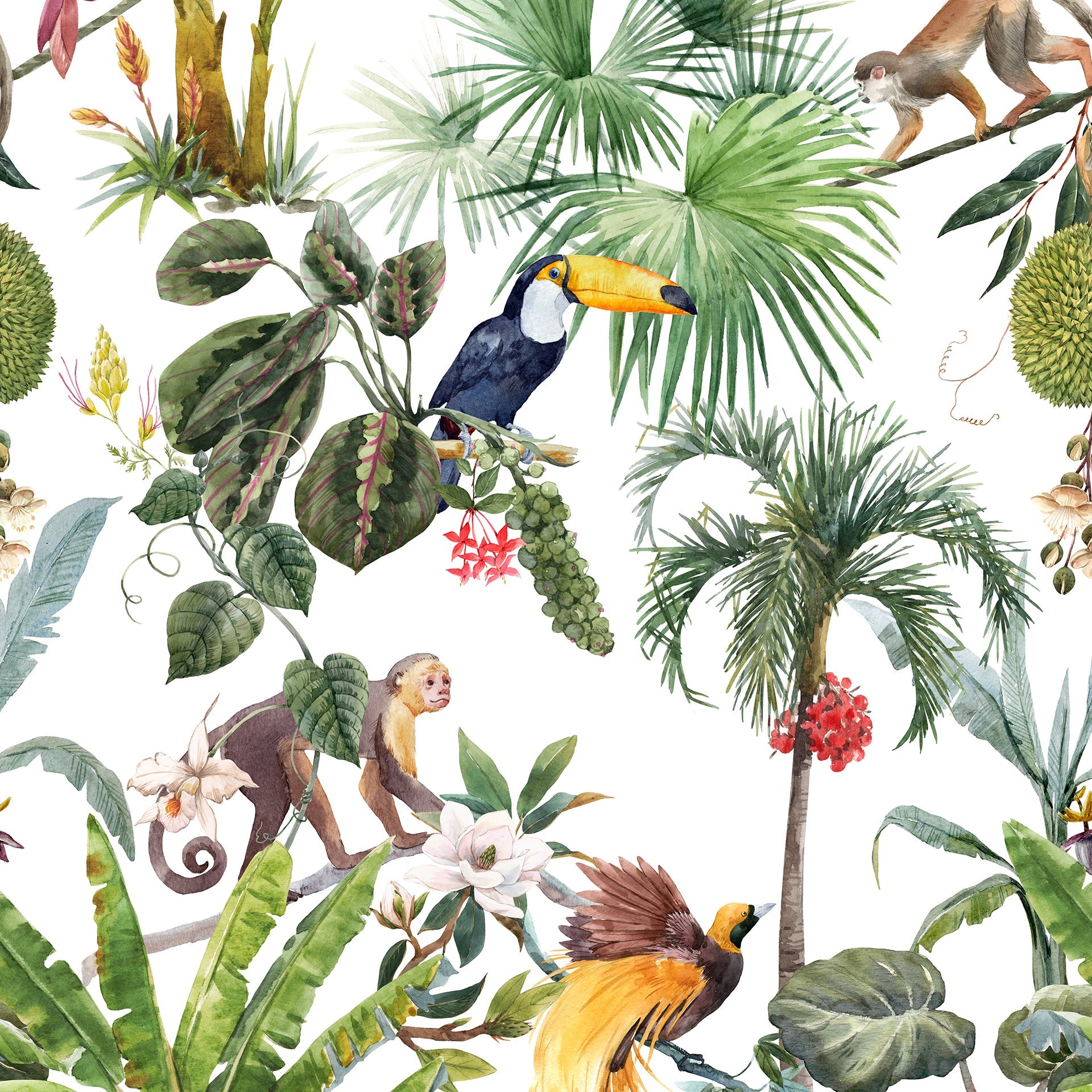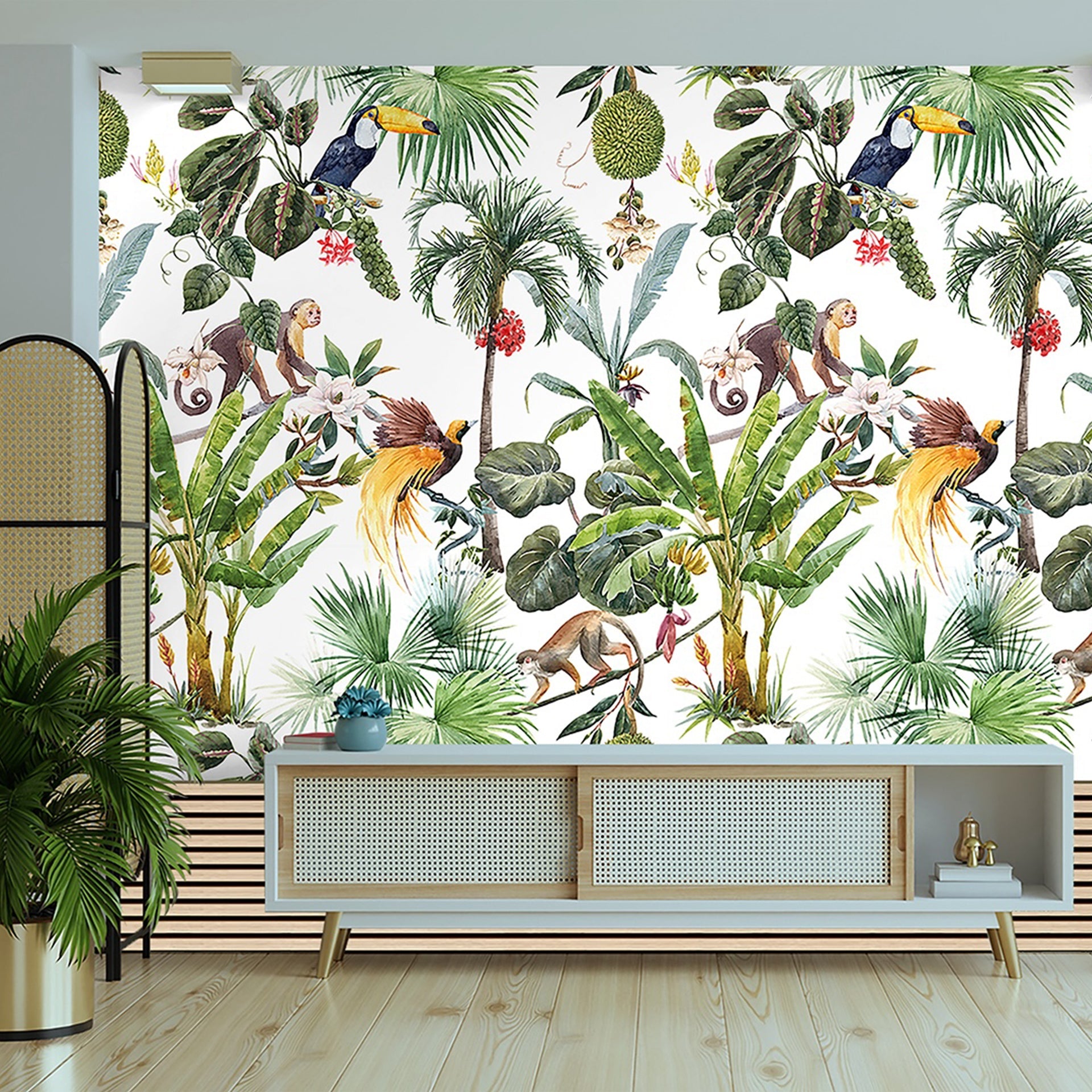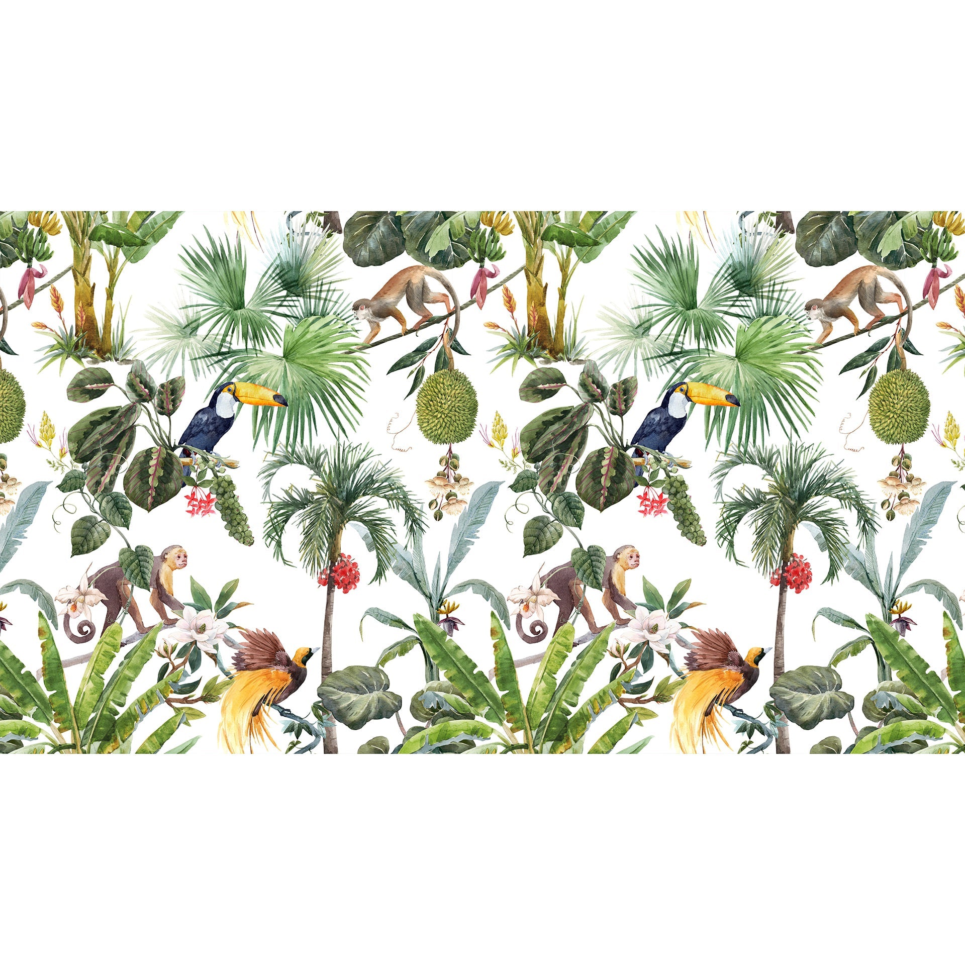 Tropical wallpaper with exotic birds, animals and trees. This exotic tropical wallpaper is for kids room, schools or playareas.
