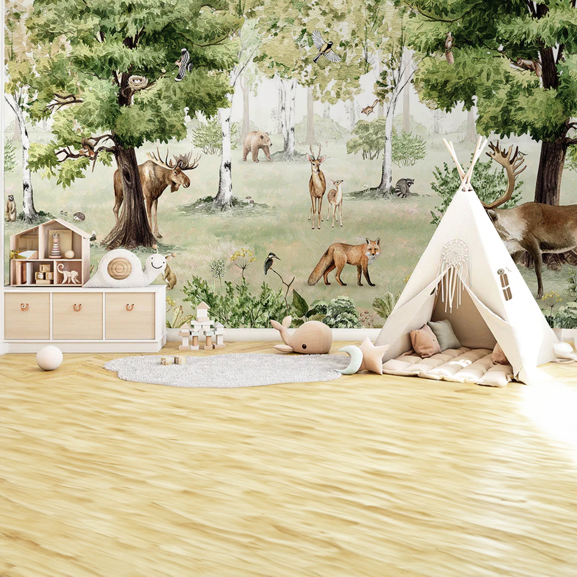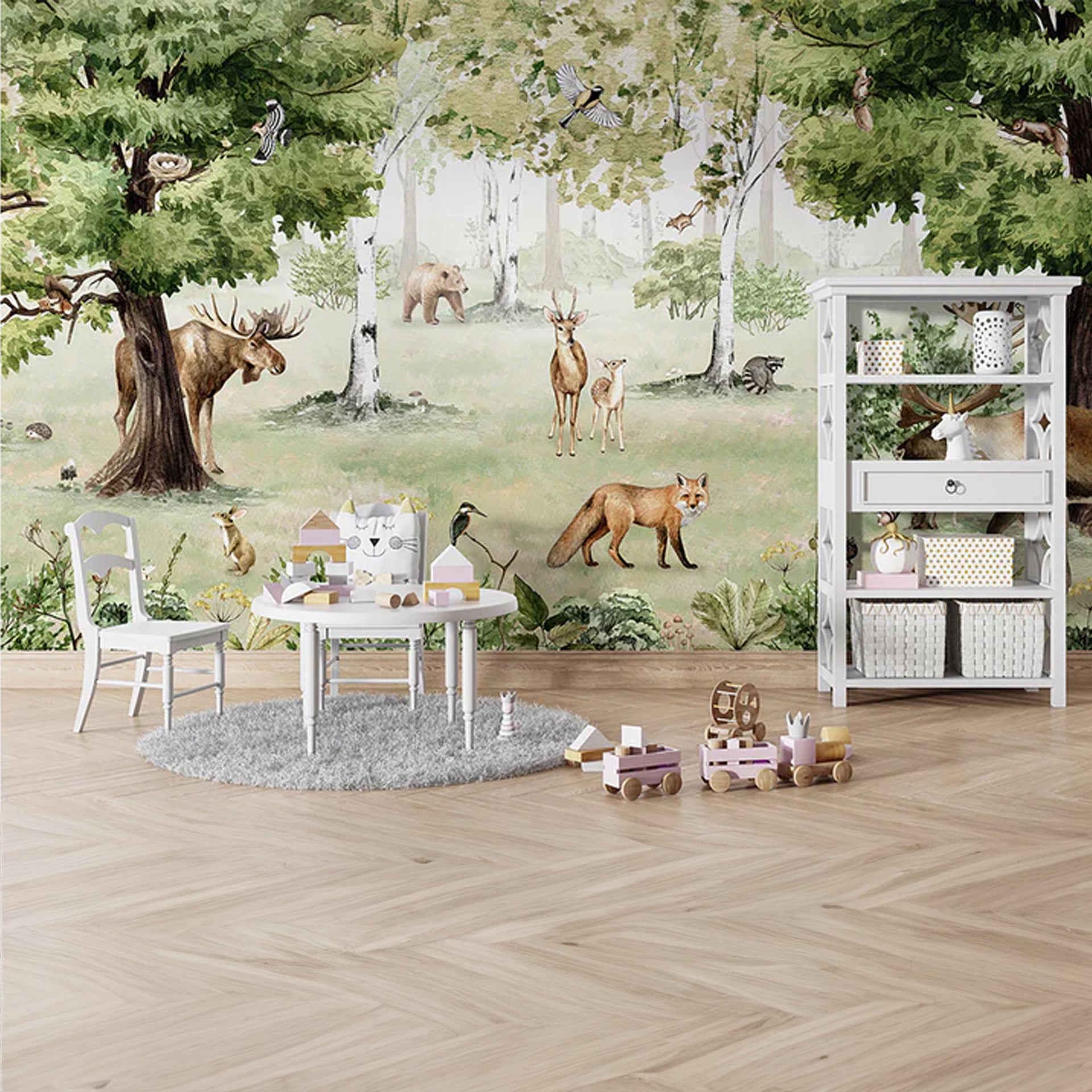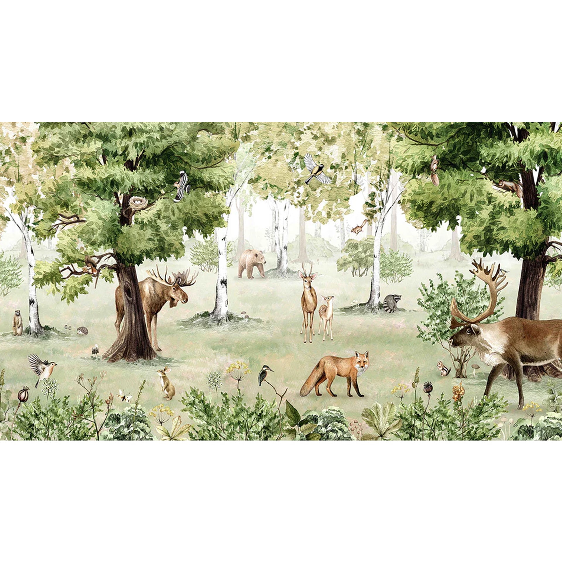 A watercolor-style forest scene filled with elk, deer, fox, bear, rabbits and birds among green trees and meadow. It evokes peaceful, natural wildlife habitat—perfect for nature lovers and educational content about forest life.