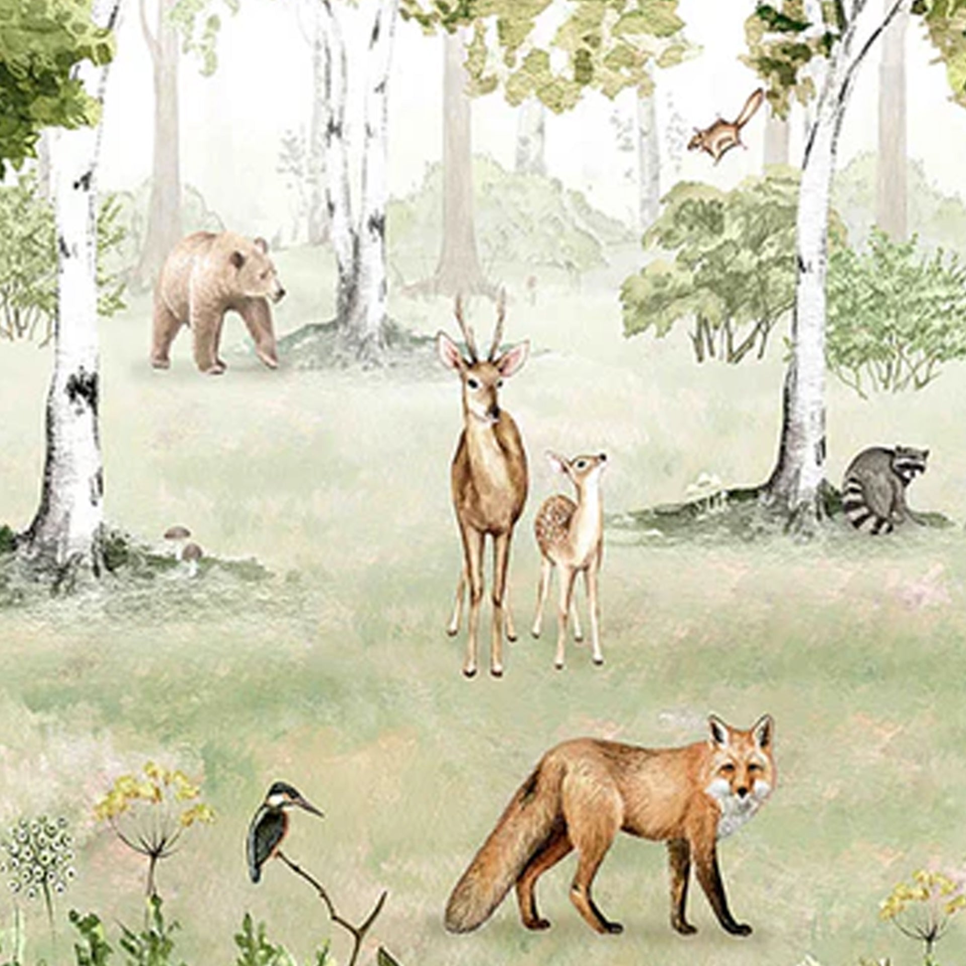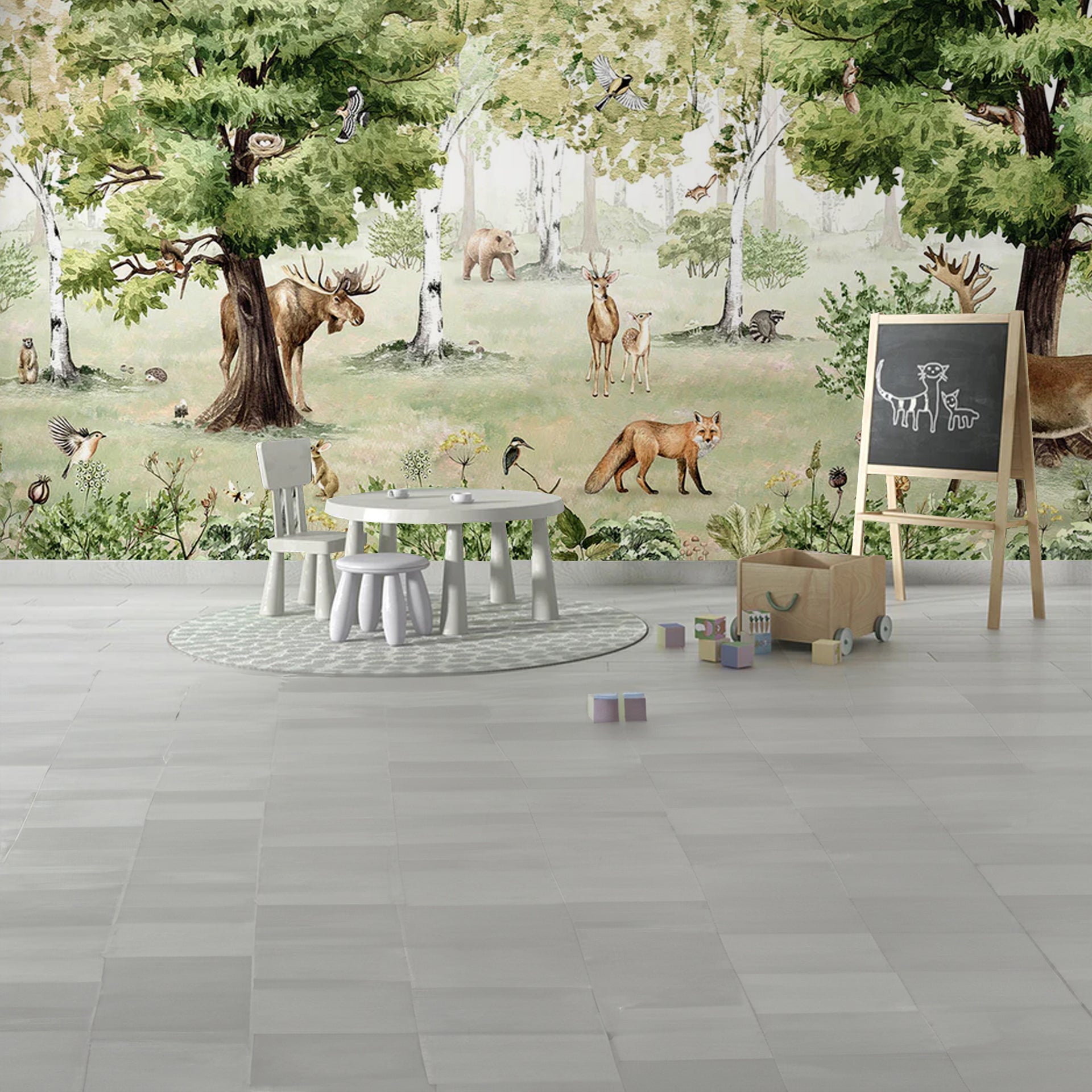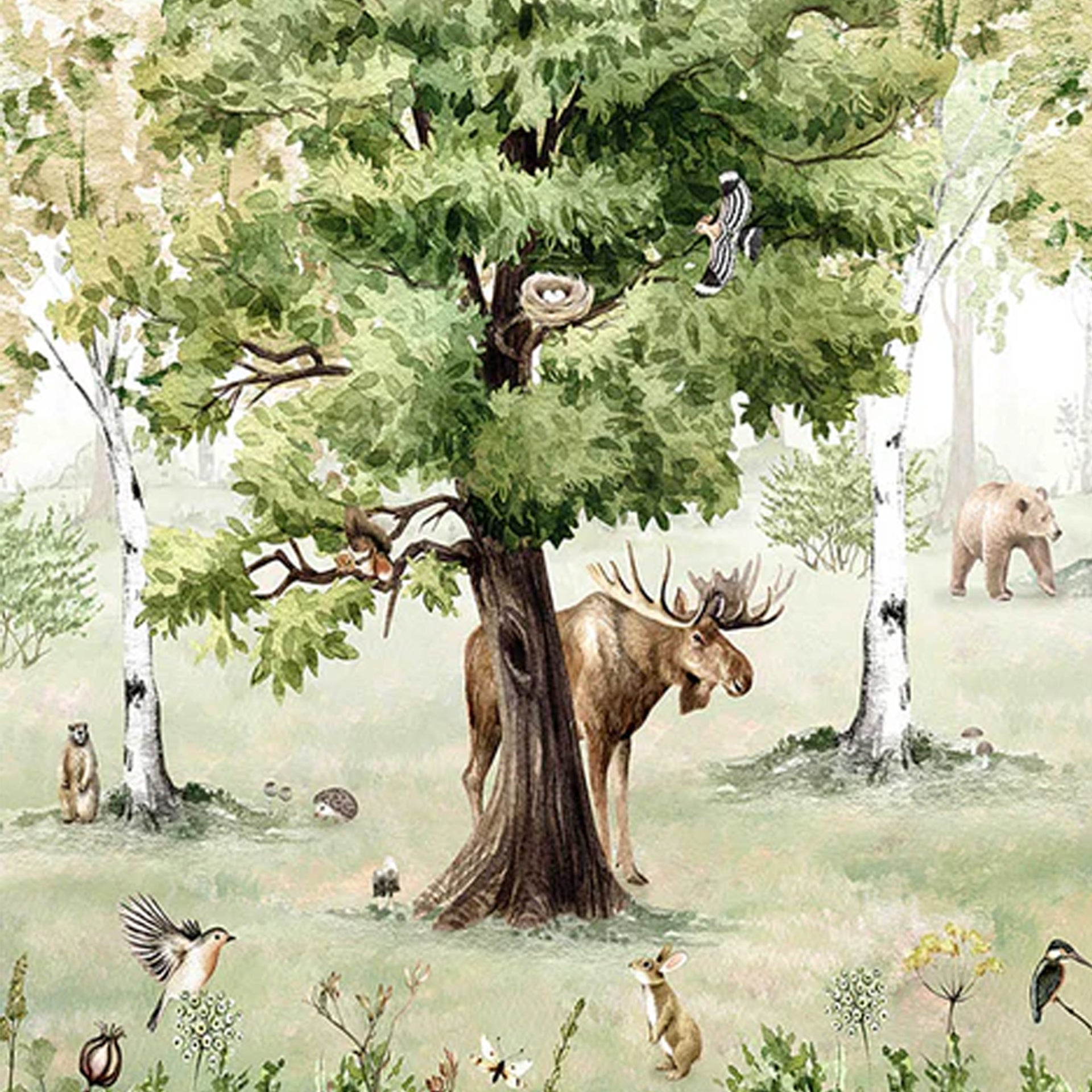 A watercolor-style forest scene filled with elk, deer, fox, bear, rabbits and birds among green trees and meadow. It evokes peaceful, natural wildlife habitat—perfect for nature lovers and educational content about forest life.